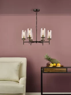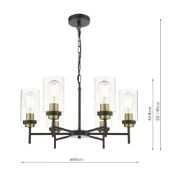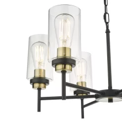 The Abel 6 light pendant is a contemporary blend of matt black metal work with satin brass accents. Featuring slender arms and clear glass cylindrical shades, it works great with our selection of Vintage Lamps. The Abel 6 light pendant makes a perfect statement ceiling light for any living or dining room.