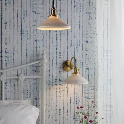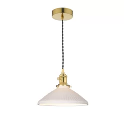 The Hadano Domed Ribbed Porcelain Shade is designed to fit our extensive Hadano range of suspensions, including 3 light bar, single pendant or wall light in aged brass on antique chrome. This slip-cast ribbed shade is made of porcelain which is slightly translucent, allowing a comforting warm glow from the outside while lit and focusing light downwards. The shade features a natural brass gallery which fits an E14 lamp holder.