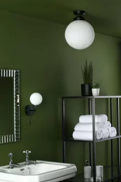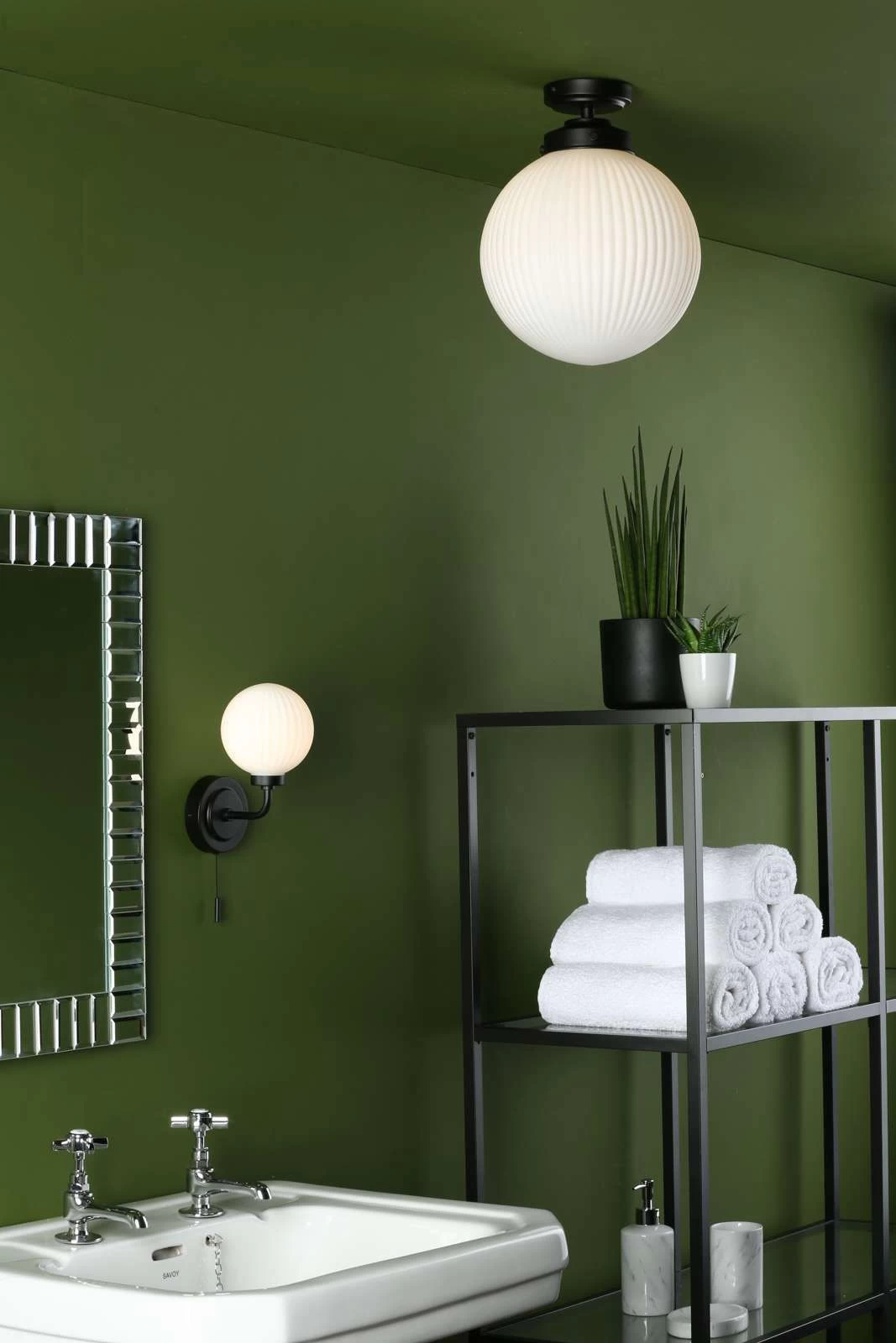 The Alrik bathroom flush ceiling light features a large gently ribbed glass opal shade and matt black metal work for that on trend look.