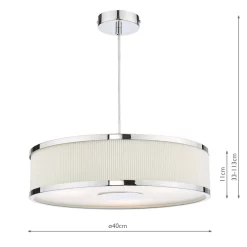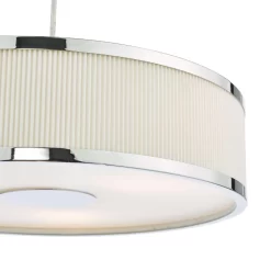 The Alvaro 3 light pendant in ivory and polished chrome with its slender profile provides a contemporary silhouette; tightly pleated cotton fabric add texture adds interest to this minimal form. This is a versatile range in two sizes and colourways.