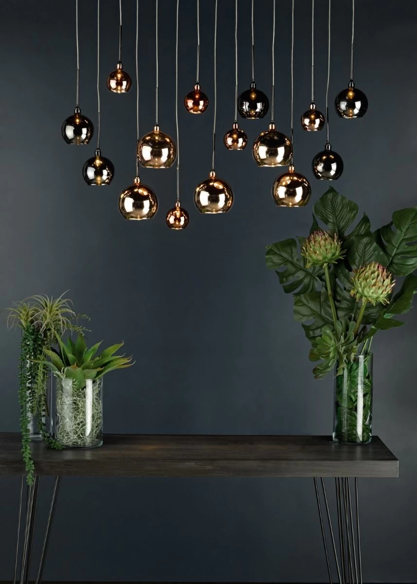 The stunning AURELIA fifteen-light linear cluster with high shine electro plated glass shades in copper, dark copper and bronze. A perfect feature over a breakfast bar or long dining table. Height adjustable with a maximum height of 90cm.