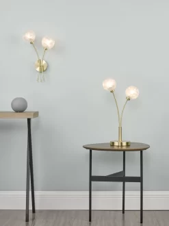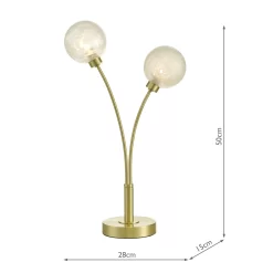 The AVARI 2 light table lamp in a satin brass finish and frost effect glass shade. The frosted glass gently diffuses the light, which makes this a perfect table lamp to place next to a sofa or beside table.