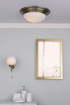 Barclay bathroom ceiling light is classically styled featuring a white opal glass shade and stepped metal work in antique brass.