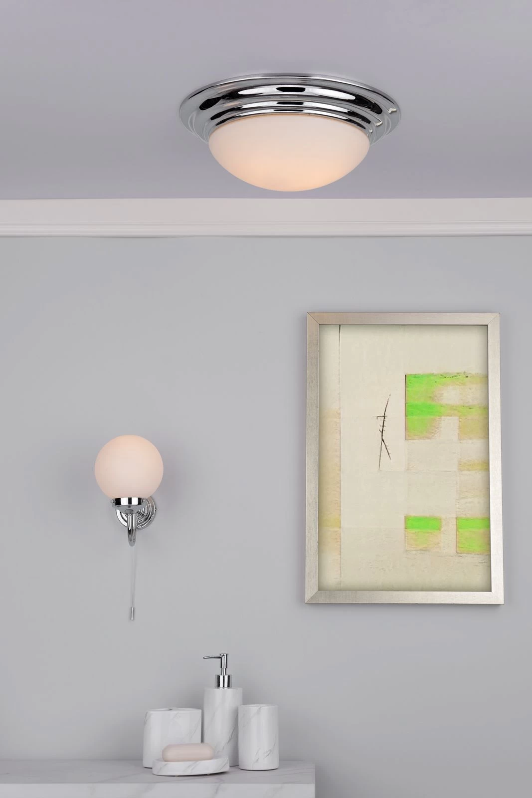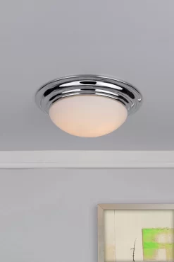 Barclay bathroom ceiling light is classically styled featuring a white opal glass shade and stepped metal work in polished chrome.