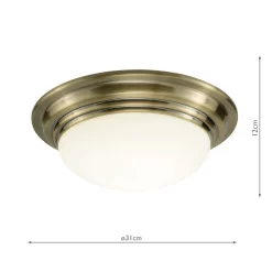 Barclay bathroom ceiling light is classically styled featuring a white opal glass shade and stepped metal work in antique brass.