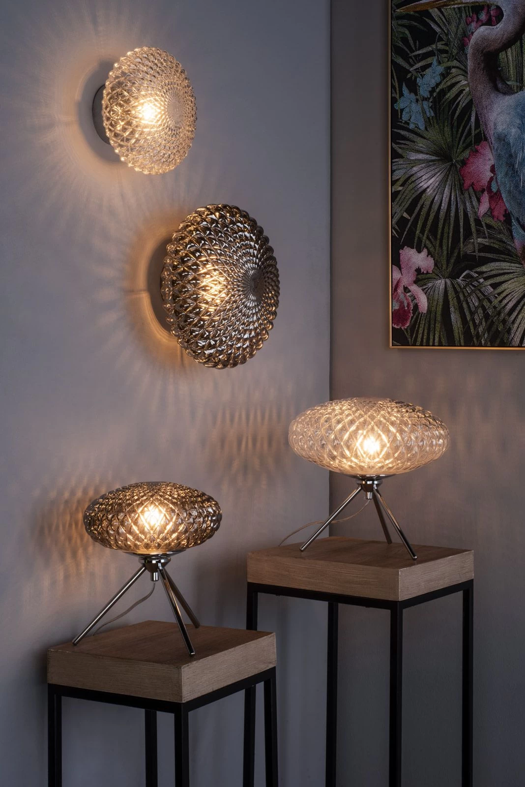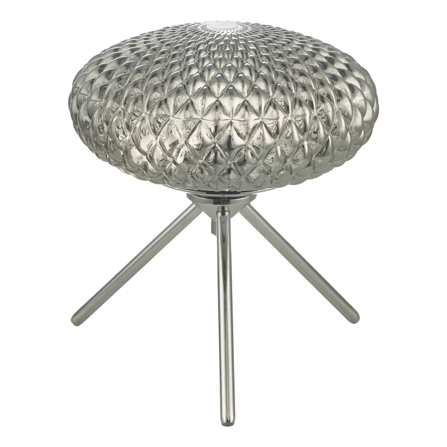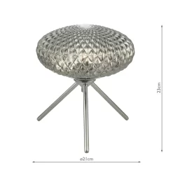 The BIBIANA is a tripod style table lamp in polished chrome, complete with a small textured smoked glass shade. Perfect on desks or as a bedside lamp