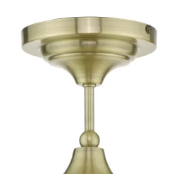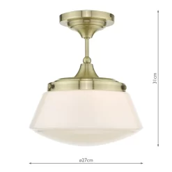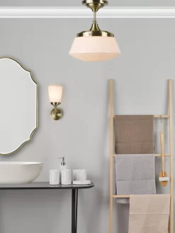 The Caden bathroom ceiling light in antique brass finish with opal glass. Is specifically designed to be safe for bathroom use in zones 1 and 2. Inspired by a 1920s school light, it looks great in traditional art deco themed interiors. This classic is rated at IP44 and can safely be used in bathrooms.