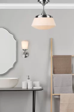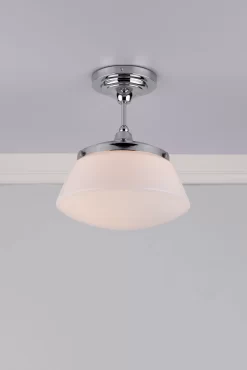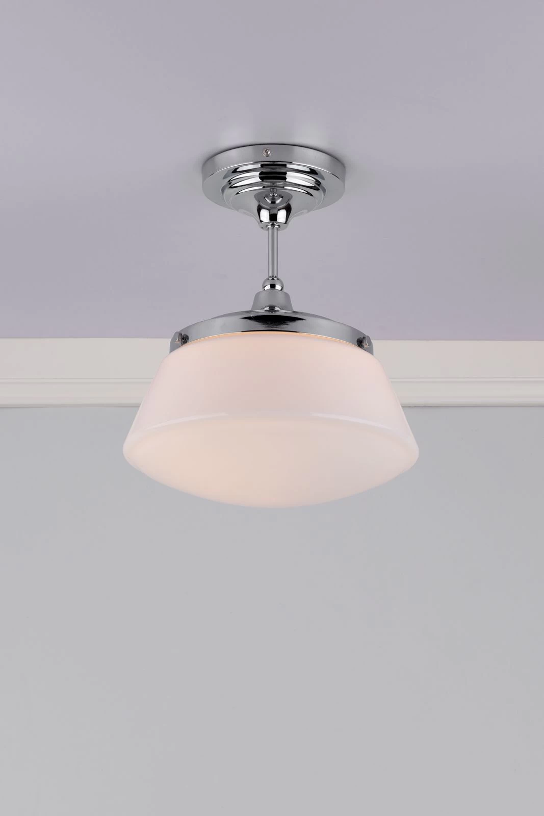 The CADEN bathroom light is inspired by a 1920s school light and looks great in traditional and Art Deco themed interiors. This classic is rated at IP44 so can be safely used in bathrooms. Finished in polished chrome and opal glass.