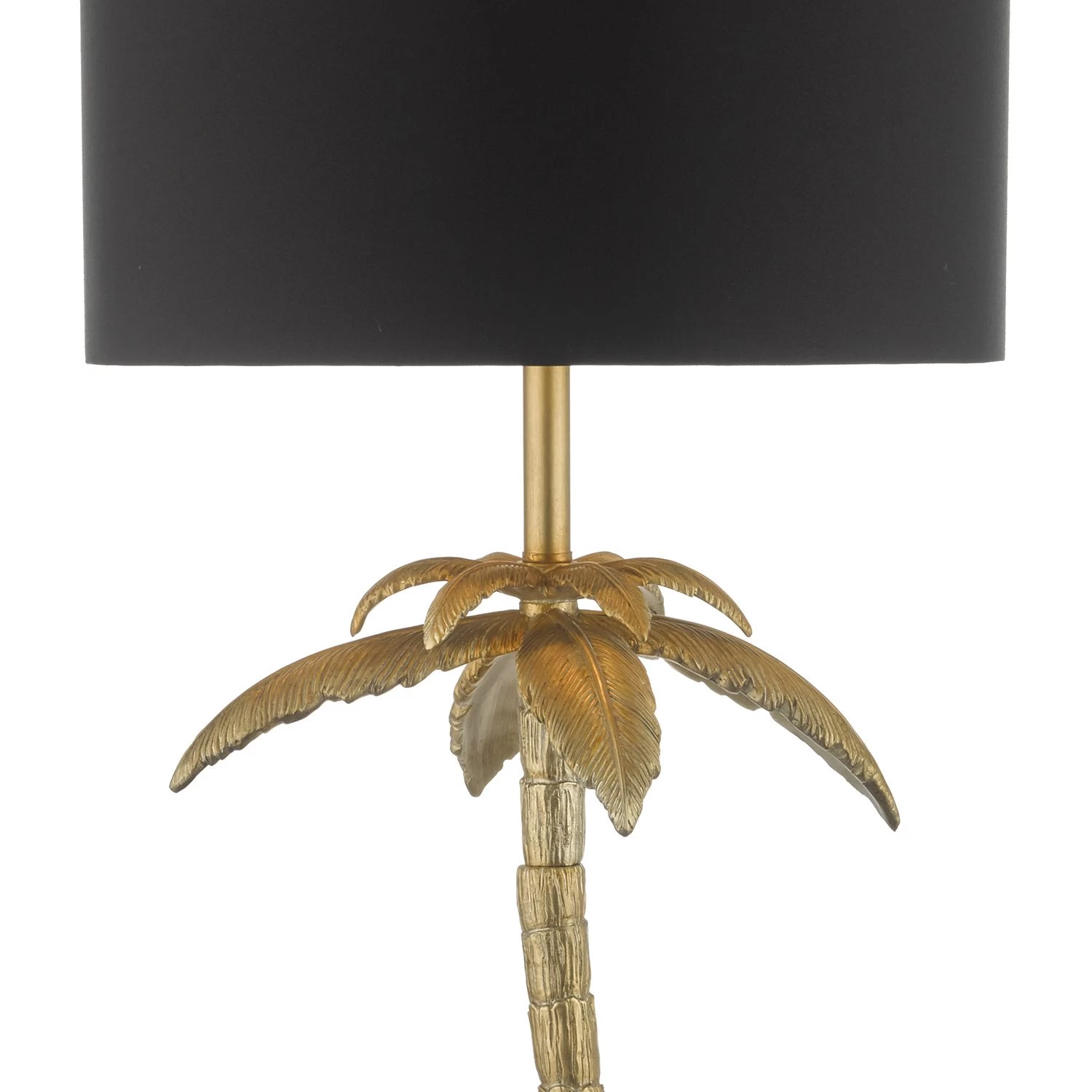 A very detailed model of a palm tree makes this floor lamp a quirky addition to your room, a statement on its own or combine it with jungle print fabrics and wall paper for a full tropical theme. The gold leaf finish adds an element of opulence, topped off with a black cotton drum shade.