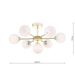 The Cohen 7 Light Semi-Flush Polished Gold & Confetti Glass Wall Light is a mid-century inspired wall light with a hand-blown art glass shade. The white glass shade is made from a mixture of clear and white glass, with a hand-blown texture. The polished gold metal fixture features a simple yet stylish curved metal arm with a black textile cable. The Cohen Semi-Flush Wall Light takes a 7 G9 bulbs (not supplied), We recommend using LED bulbs from our range of LED bulbs