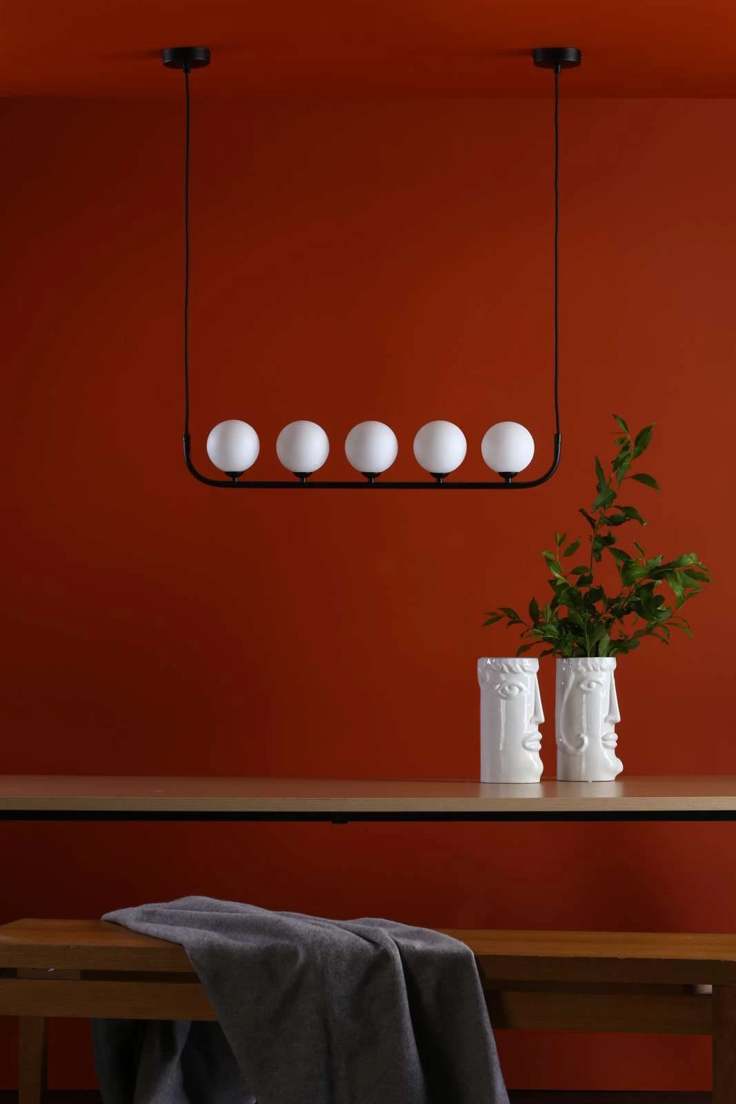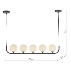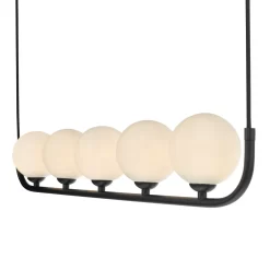 The Cradle 5 light bar pendant is a exercise in modernist design. It is notable for the simplicity of its well-proportioned radius arms, teamed with glass orbs that appear to balance, breathtakingly, on the fine tubing. The linear 5 light pendant make it perfect for use in a modern kitchen interior or over a dining table.