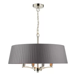 The Cristin is an elegant four-light pendant in a vintage polished nickel finish. A simple, tapered shade surrounds the four lamp holders. This rather special shade is hand wrapped in a grey ribbon. The layers of ribbon are visible both inside and outside the shade, giving the Cristin a beautiful appearance from any angle.