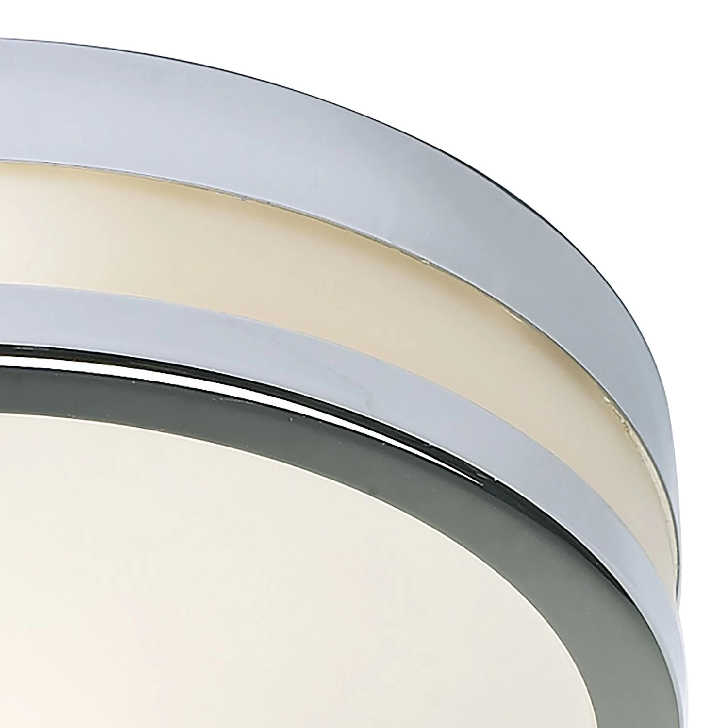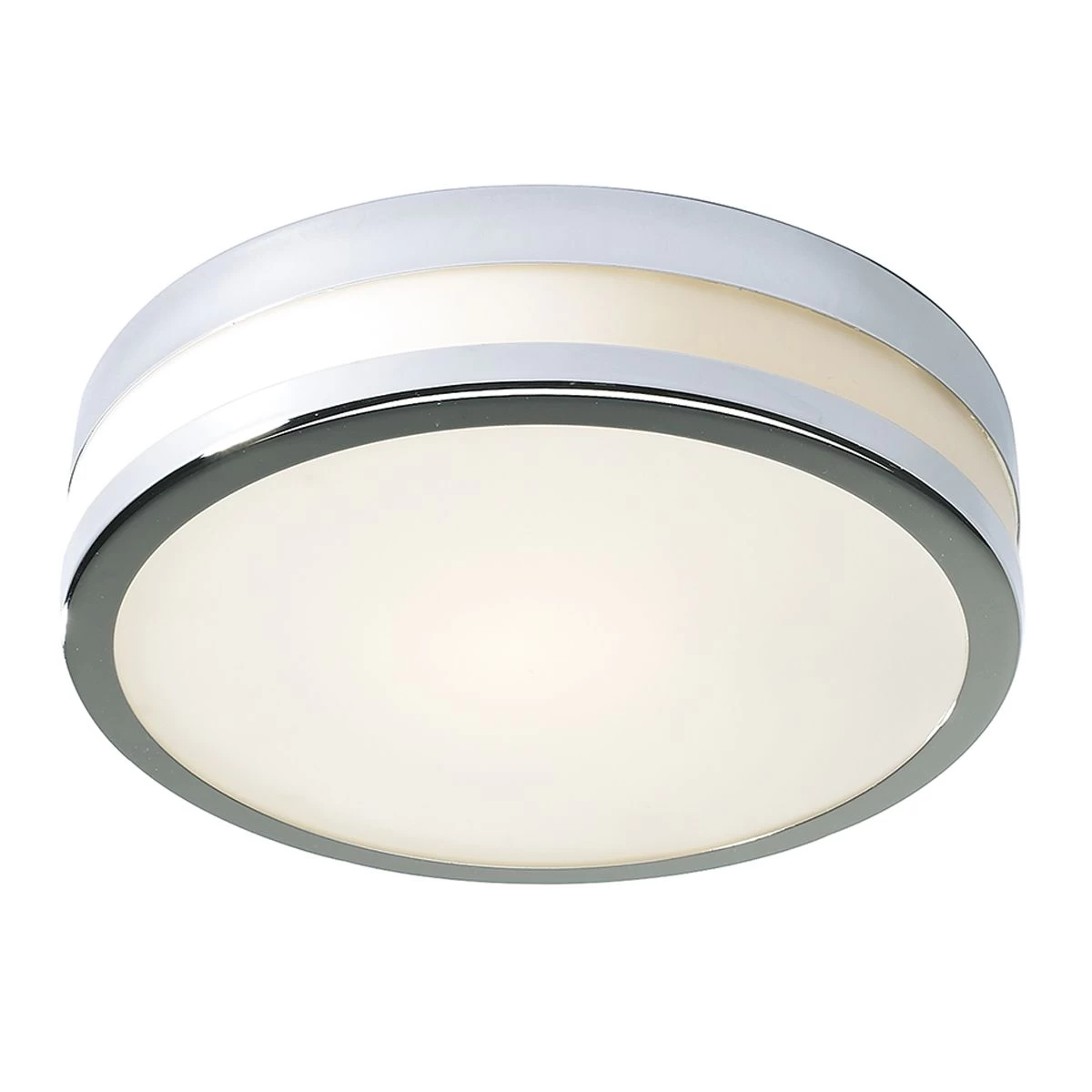 The CYRO Bathroom IP44 Large Flush features decorative polished chrome circular bands on an opal glass shade.