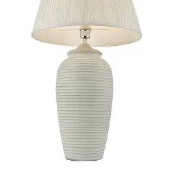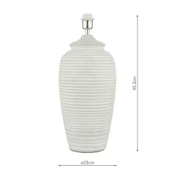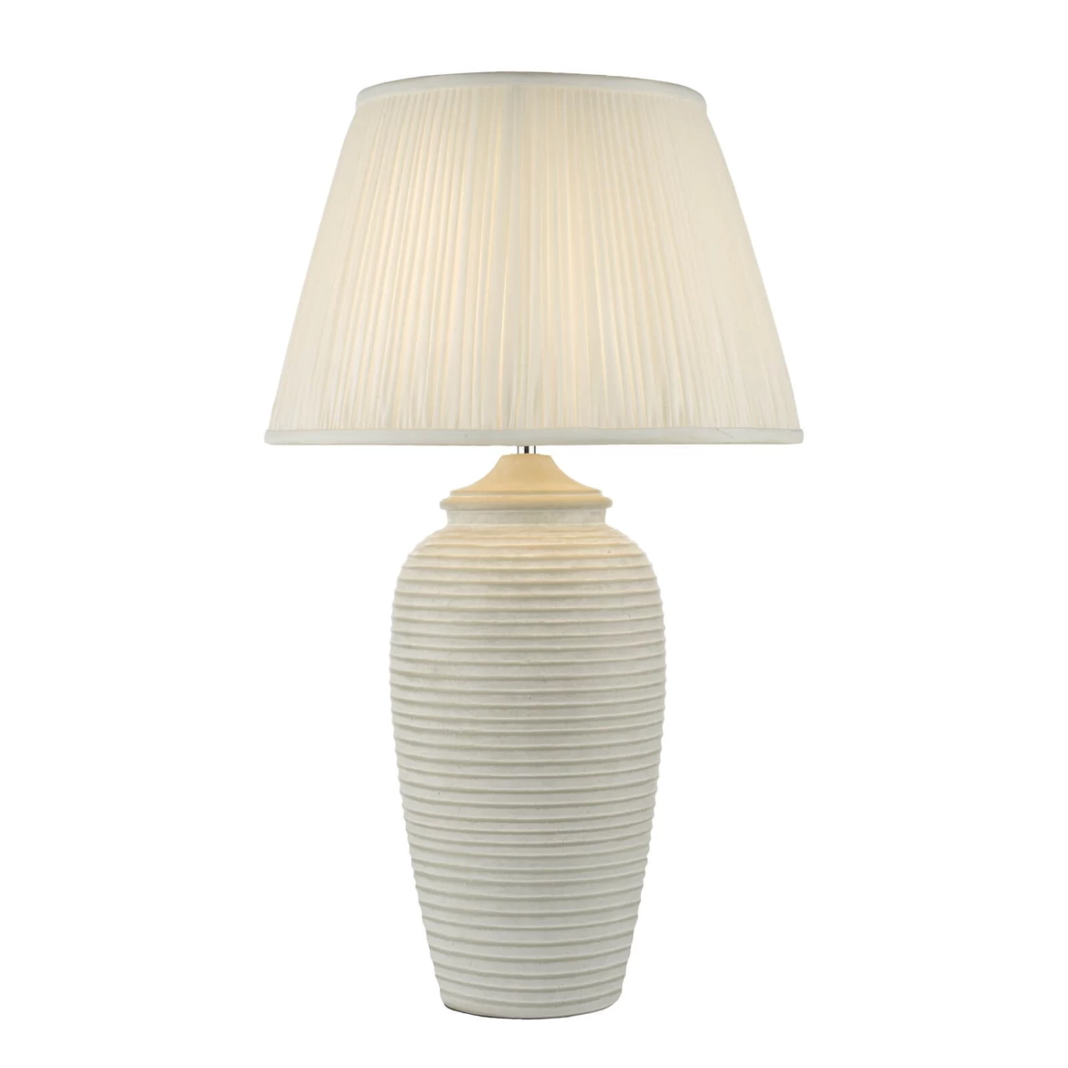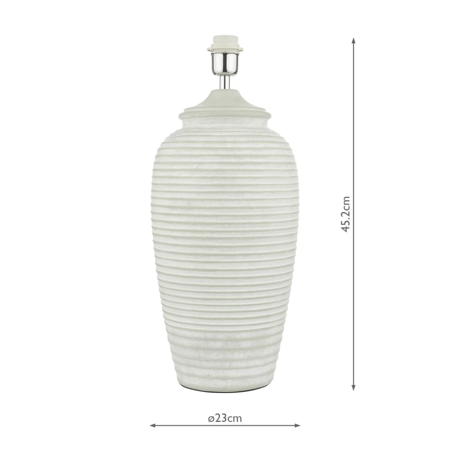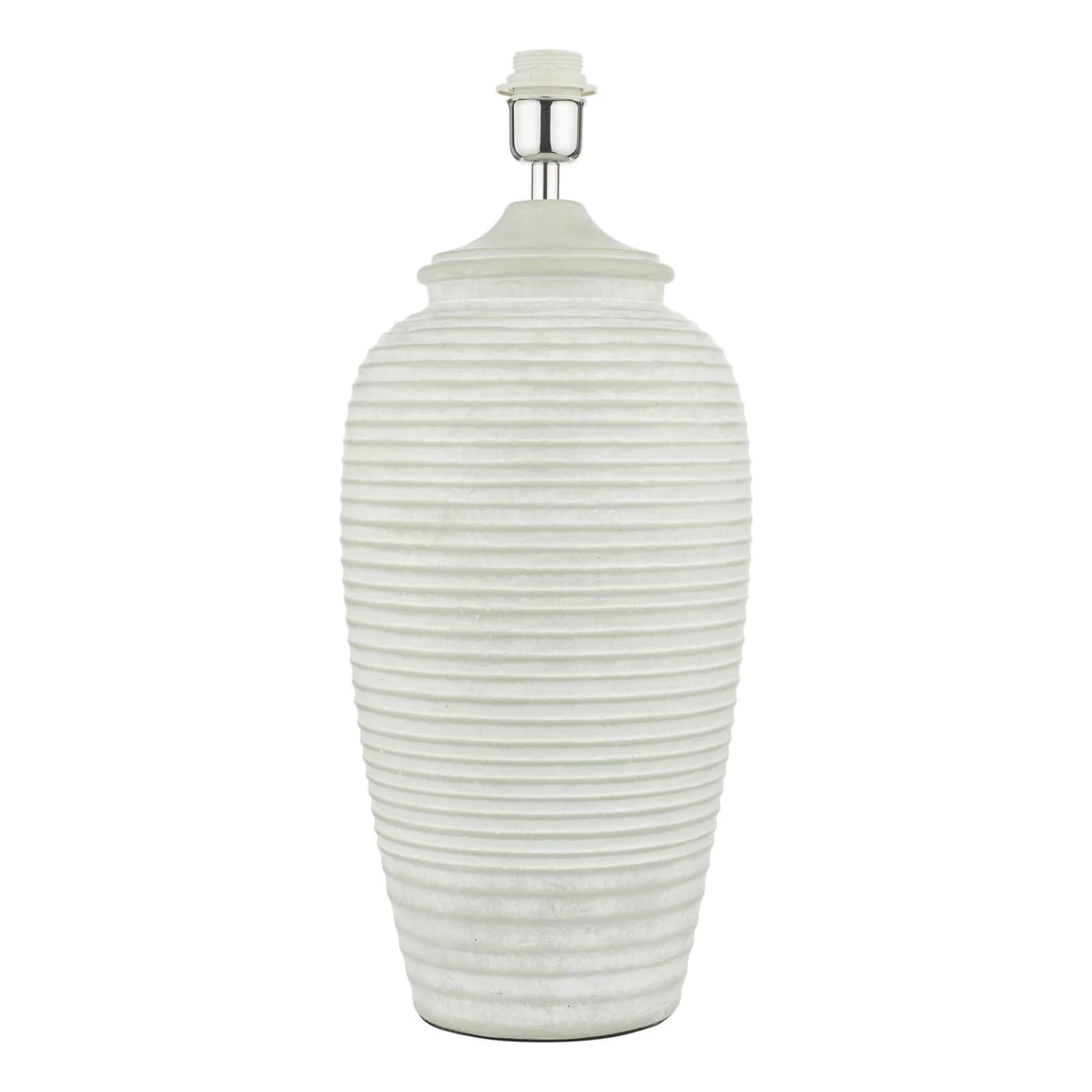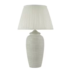 The grandly scaled Deighton Table Lamp is an earthenware lamp with hand-applied gently ribs. Finished in grey with a light whitewash and fitted with a polished chrome lamp holder.