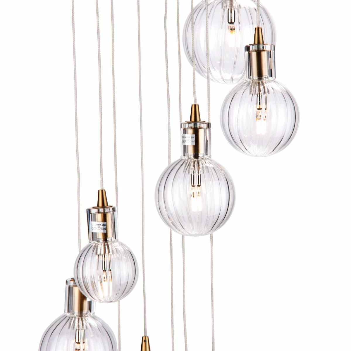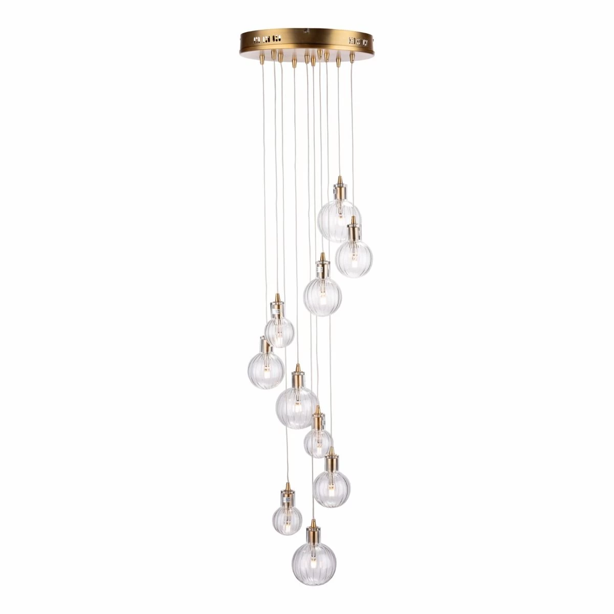 The enchanting Dita features a warm brass finish with an assortment of ribbed glass shades.