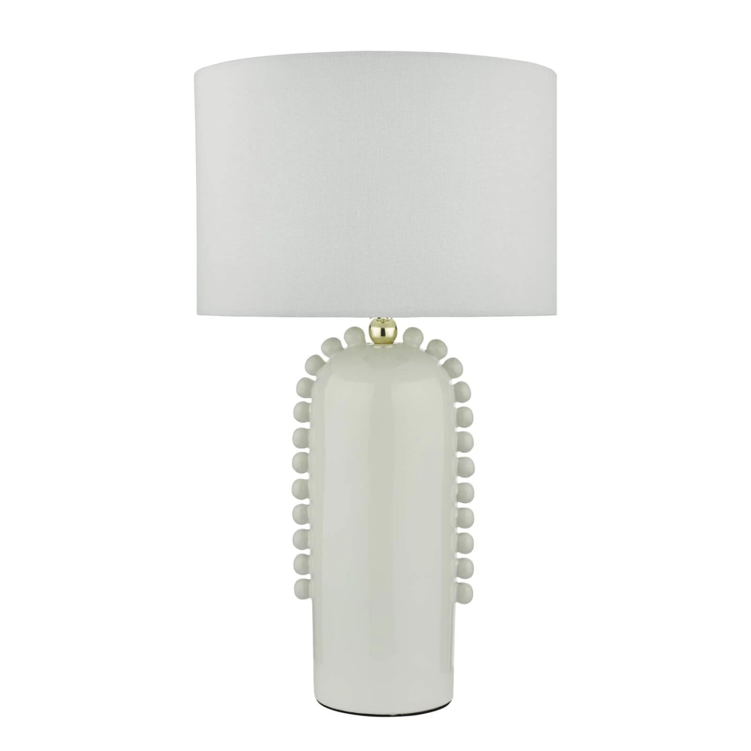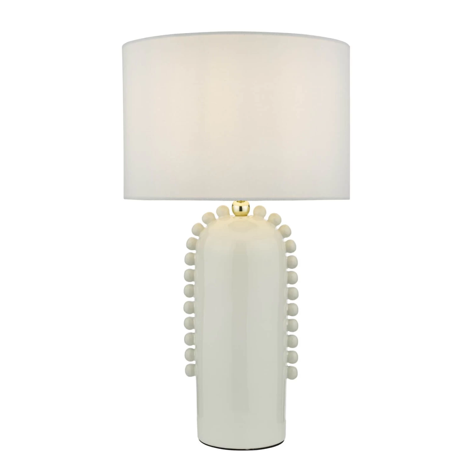 The ultra-trendy Dolce Ceramic Table Lamp has a line of hand-applied bobbles along its silhouette finished in a glossy ivory glaze with polished gold details and a white cotton shade.