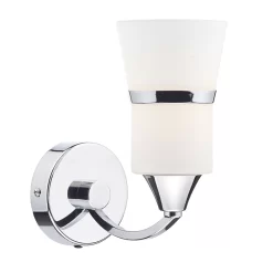 The timeless DUBLIN wall light features a tall opal glass shade with a decorative brushed metal band on a simple polished chrome bracket.