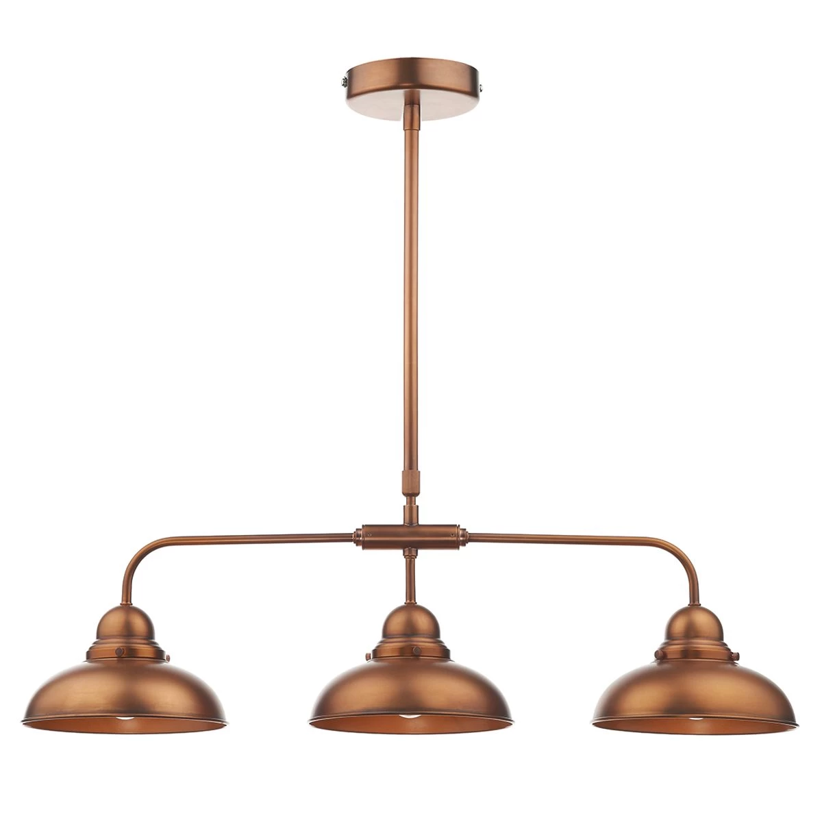 The DYNAMO 3lt Pendant features an antique copper ceiling plate and a metal retro-styled shades in antique copper.