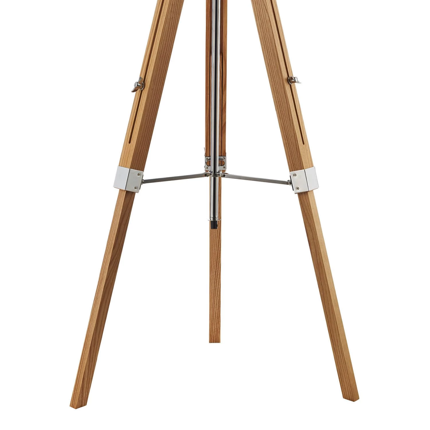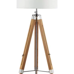 The height adjustable tripod base of the EASEL Floor Lamp base is finished in light wood with polished chrome trim.