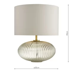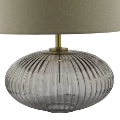 The Edmond table lamp has a modern ribbed glass base in smoked glass with antique brass details and a grey braided cable.