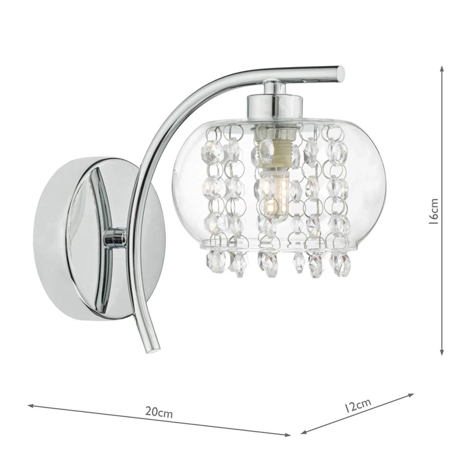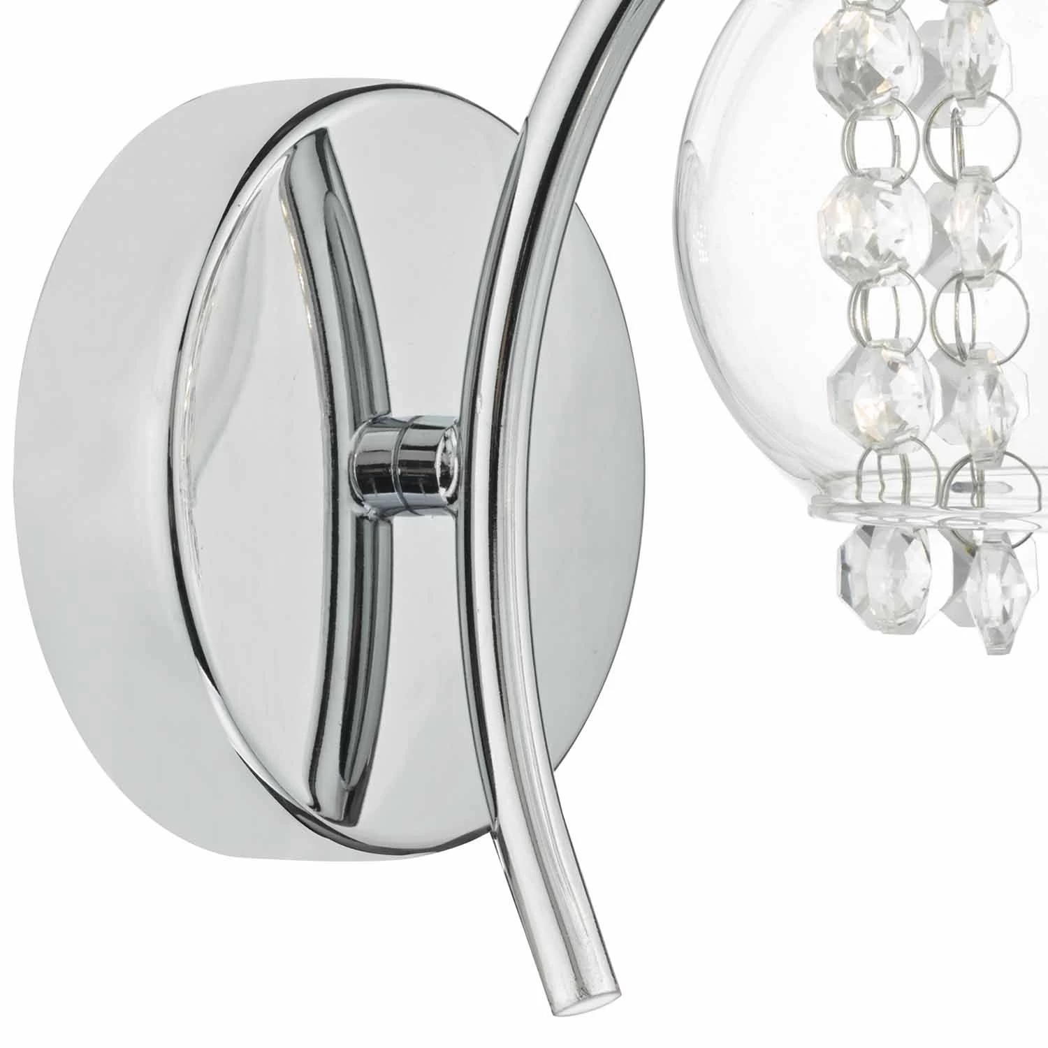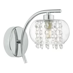 The ELMA wall light features crystal glass beads that sparkle intensely as they diffuse the light encased in a glass shade This pretty wall light, finished in polished chrome.