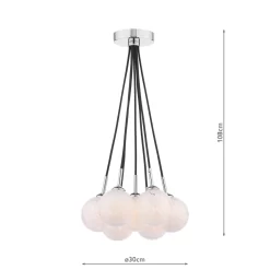 The Elpis 7 Light Cluster Pendant with a cluster of small globes that make a striking statement over dining tables or as a stairwell light. The Elpis cluster pendant features hand-blown white confetti glass globes with a polished chrome metal frame. The cluster pendant features a black braided cable.