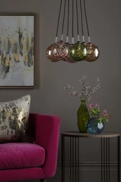 A seven-light cluster pendant with a polished chrome ceiling plate, black fabric cables and oversized glass dimple shades in a mix of pink, amber and green. The Elpis cluster pendant can be hung with the glass all at the same level creating a bunching effect or it can be adjusted with the help of your electrician to have the glass at different levels for a different look.