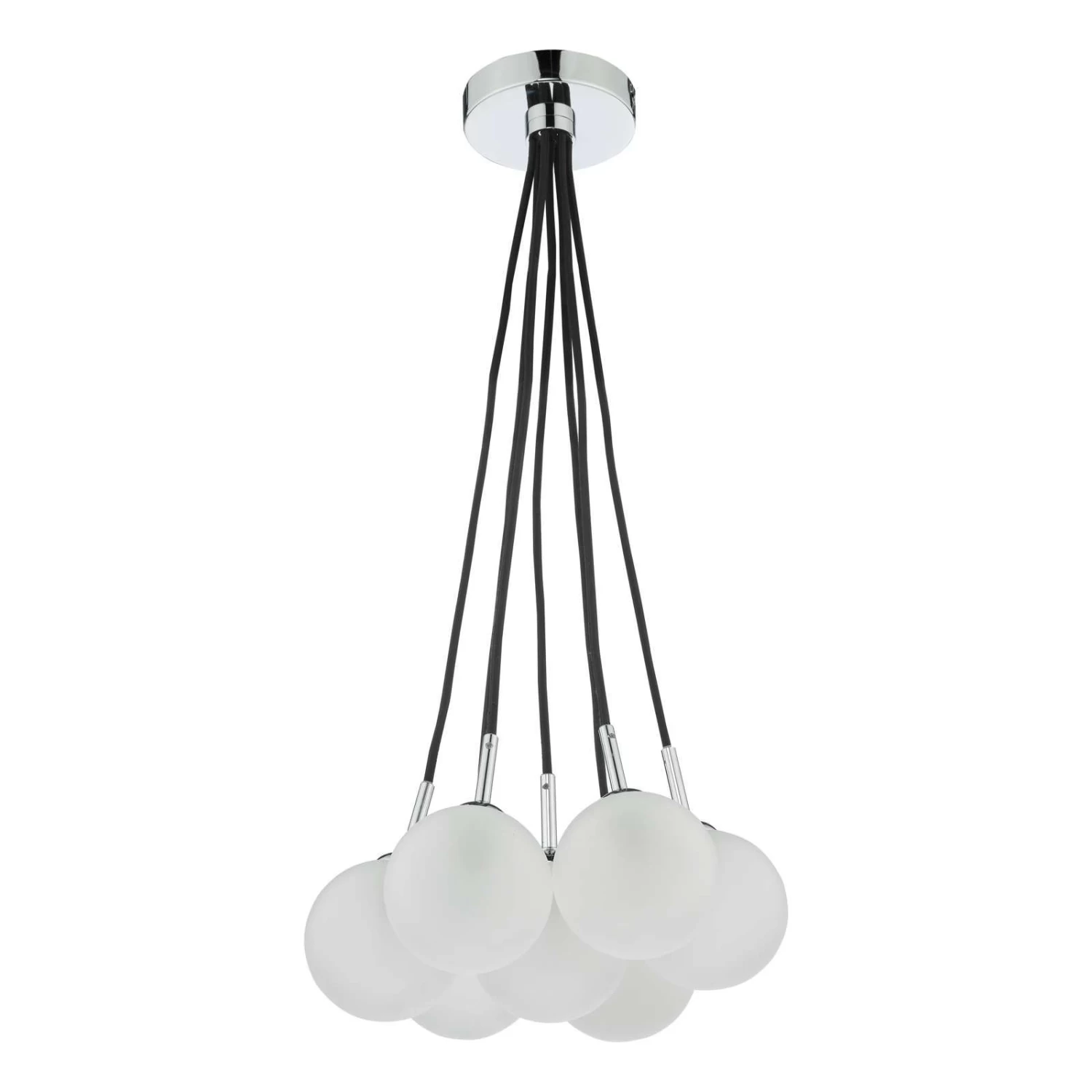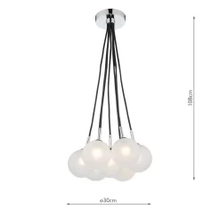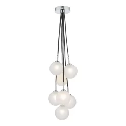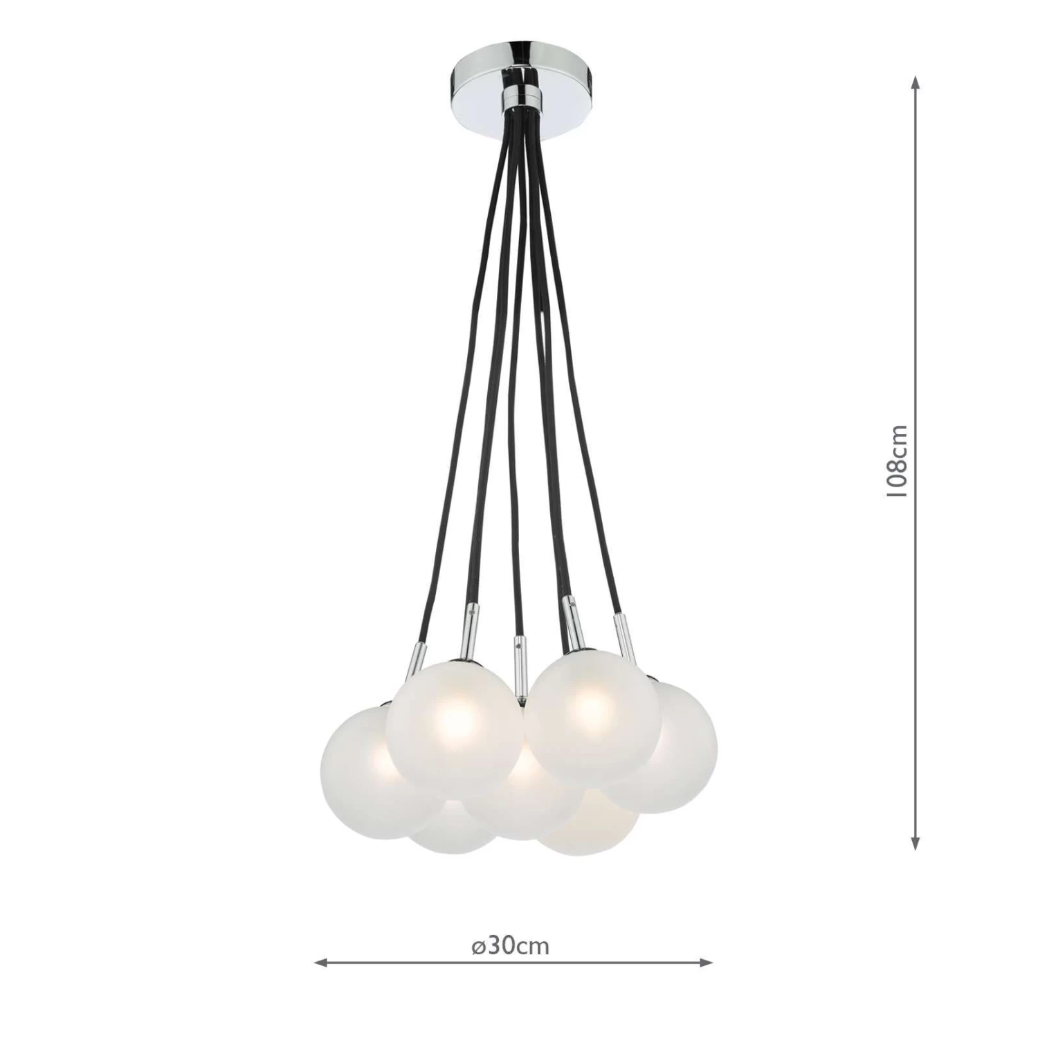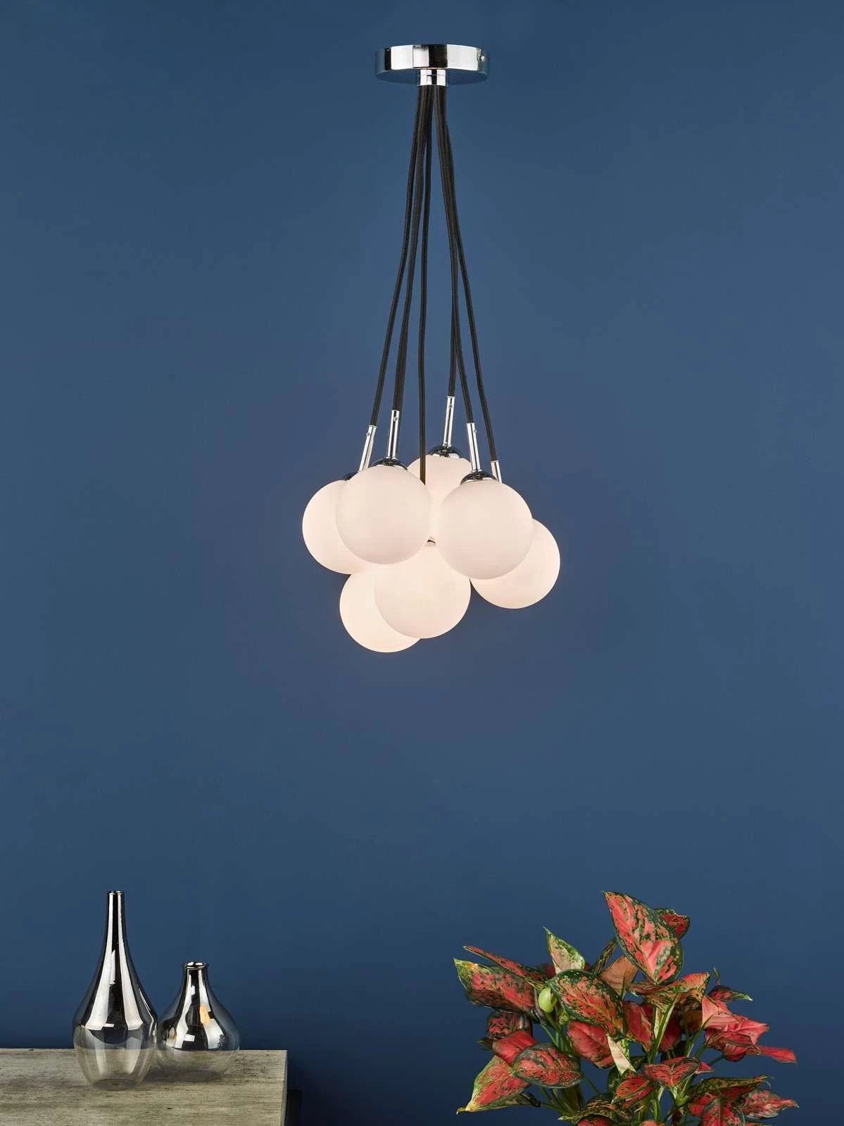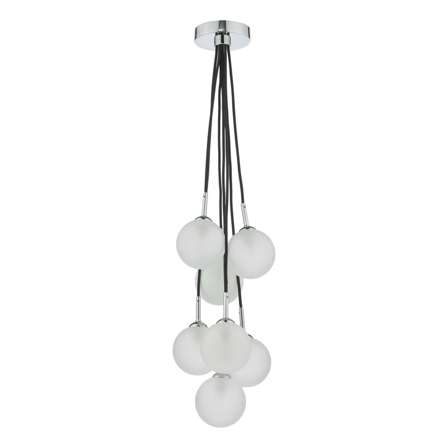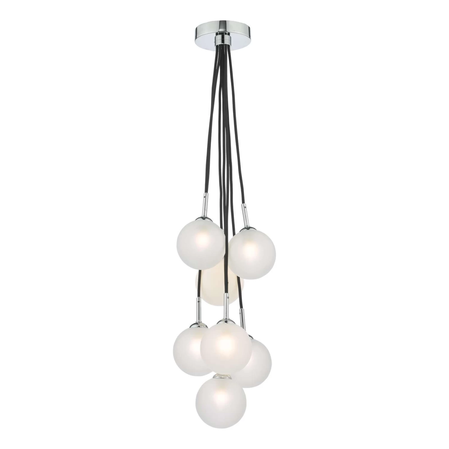 A seven light cluster pendant with polished chrome ceiling plate, black fabric cables and opal glass shades. The Elpis cluster pendant can be hung with the glass all at the same level creating a bunching effect, or can be adjusted with the help of your electrician to have the glass at different levels for a different look.