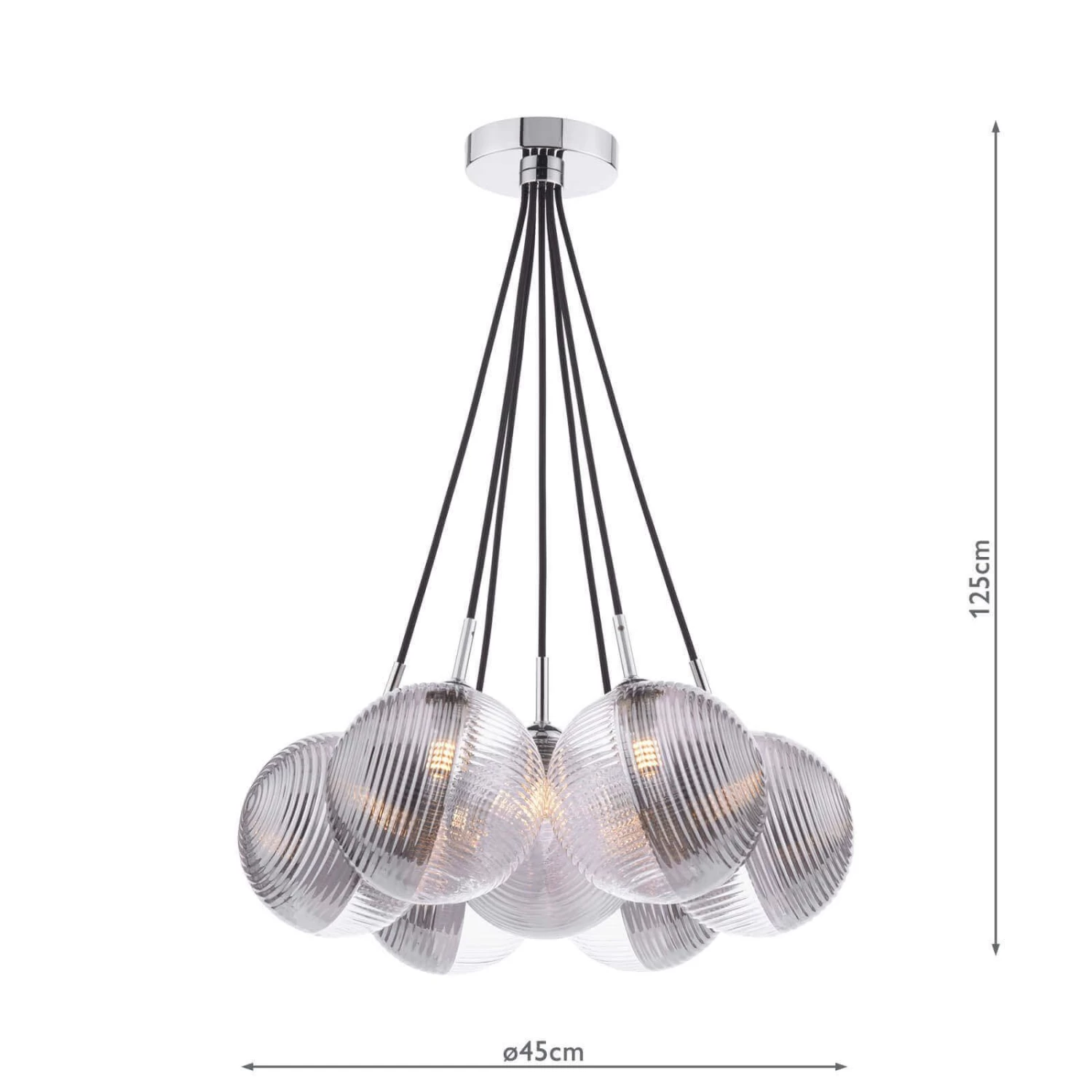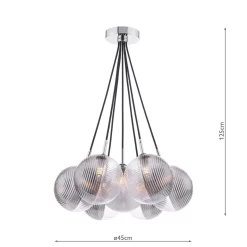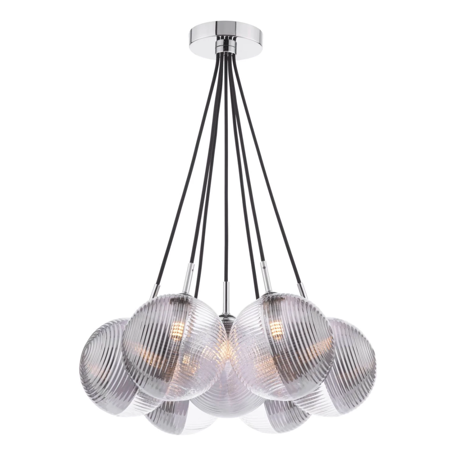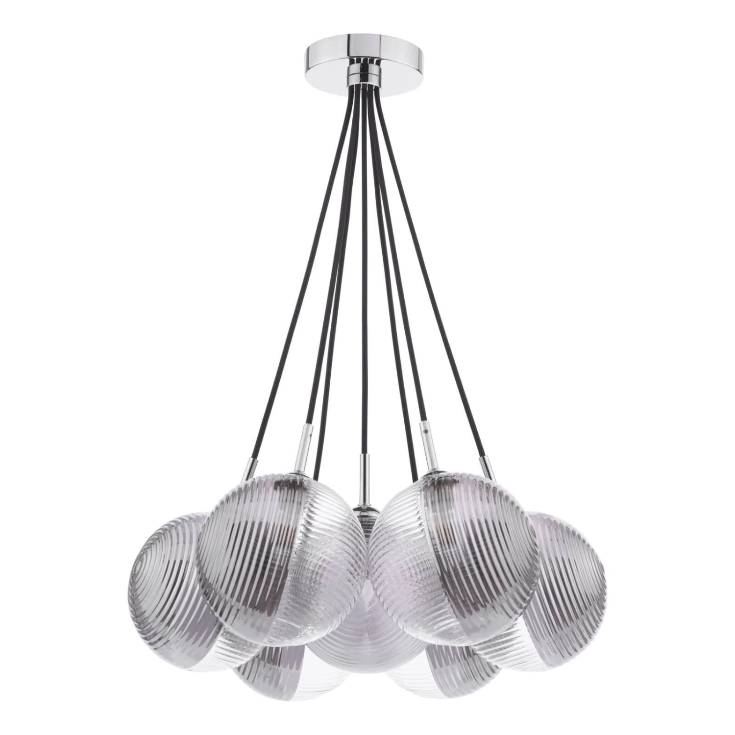 The Elpis 7 Light Cluster Pendant is part of a beautiful collection of lighting that combines smoked and clear ribbed glass in a contemporary cluster pendant. The Elpis cluster pendant features a black braided cable looks great over a dining table or as a dramatic stairwell light. The Elpis cluster pendant casts a beautiful ambient light that is both stylish and functional.
