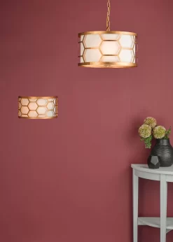 The Epstein Wall Light EPS0712 an eye-catching laser cut metal wall light. Lined with an ivory linen shade, this fitting has a hand applied distressed gold leaf finish. This wall light looks fabulous paired with it’s matching pendant EPS0312.