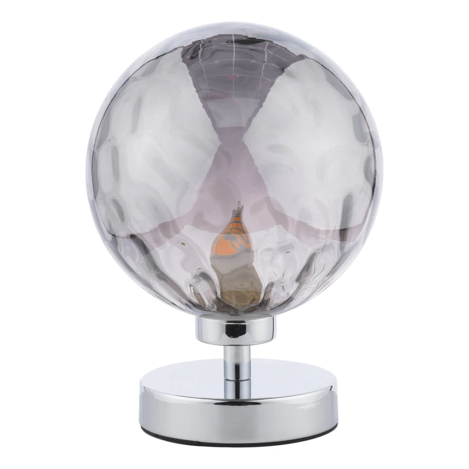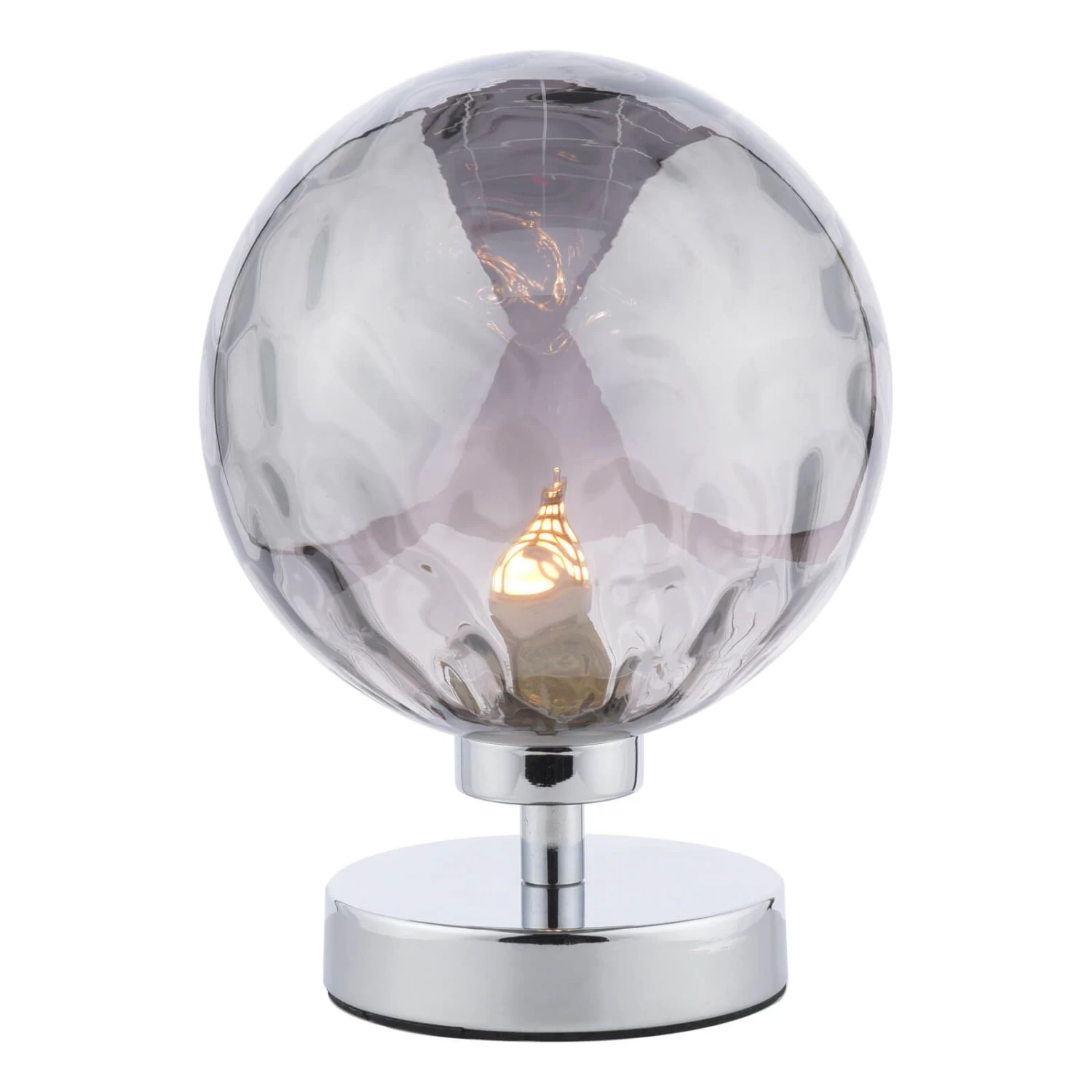 The ESBEN touch table lamp in polished chrome with large smoked dimple glass. The touch lamp can be switched on with a light touch anywhere on the metal base. The Esben table lamp is also available in various finishes with different glass options.