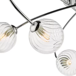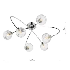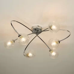 The contemporary Etta 6 light semi-flush ceiling light features long sweeping arms and twist ribbed glass shades. The Etta semi-flush ceiling light’s large diameter and low height make it a perfect choice for large rooms with low ceilings, such as living rooms, bedrooms or dining rooms.