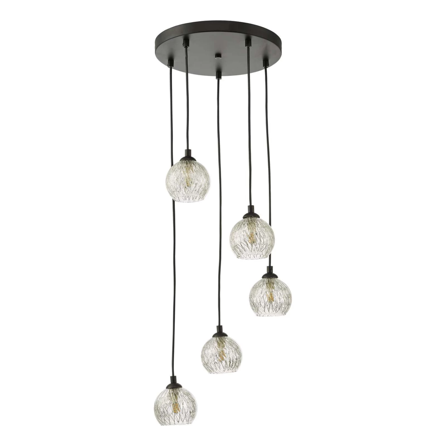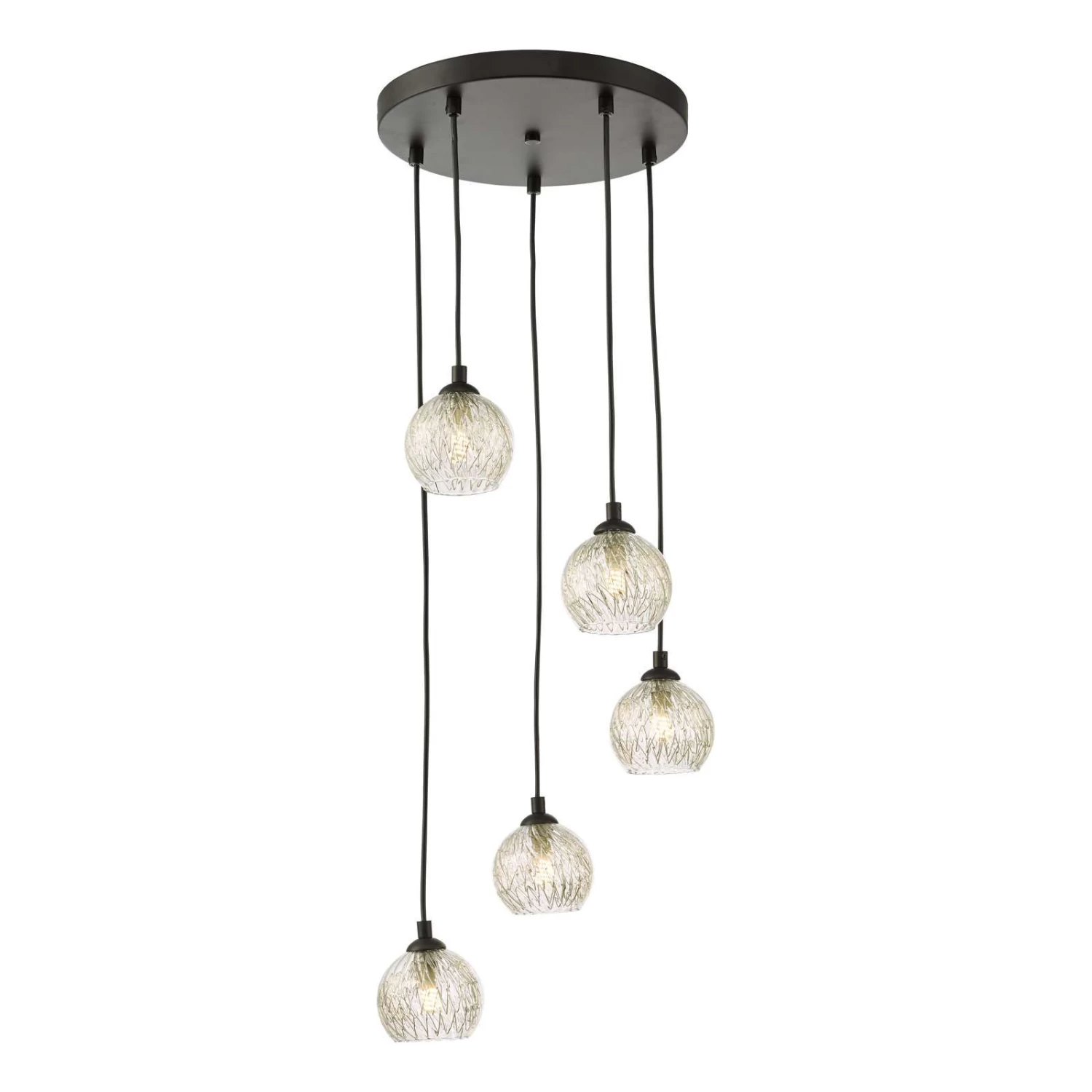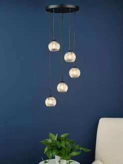 The Federico spiral cluster pendant is a minimal design in matt black with 5 spiralling glass shades of clear glass and aluminium wire detail. We find it’s minimalism so versatile and refreshing, it’s just at home as a stairwell light as it is lighting a dining table or over a bed. The black fabric cable can be adjusted on installation but if you want to go very short you will need the help of an electrician.