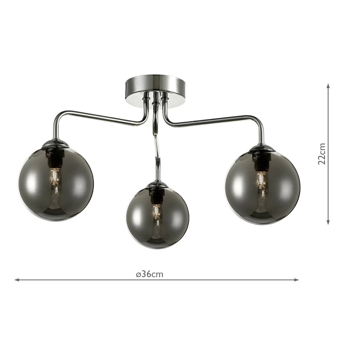 The FEYA 3 light semi flush ceiling light in polished chrome and smoked glass. A simple semi flush ceiling light designed in a modernist style with simple arms yet elegant arms. The height of the Feya ceiling light make it easy to place in most modern rooms where the ceiling height is often lower