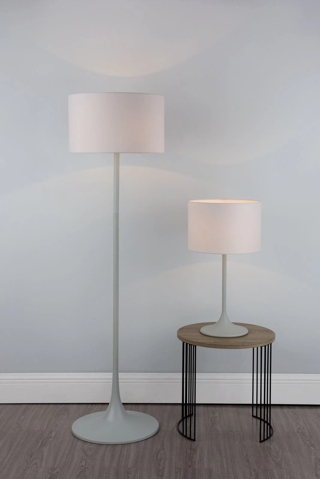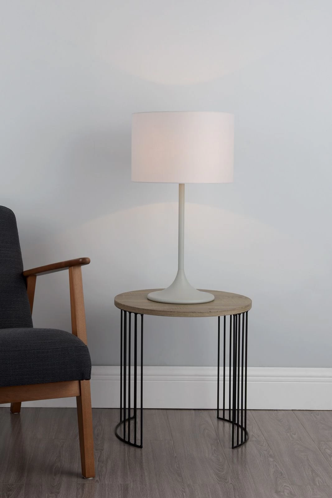Complementing the slender base is a matching grey lampshade that not only enhances the lamp’s overall elegance but also provides the perfect contrast to its design. The shade diffuses a warm, inviting light, creating a cosy atmosphere in any room. Whether placed on your bedside table, living room sideboard, or as a centrepiece on your side table, this lamp will instantly become a conversation starter, captivating the attention of your guests.