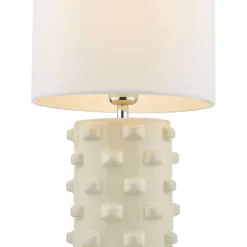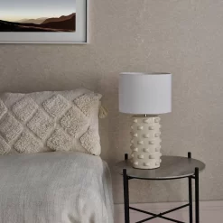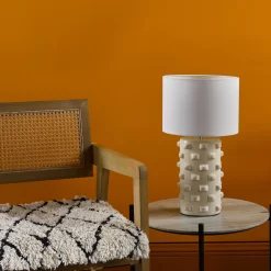 The Georgina Table Lamp White is a modern take on a classic design. Our designers were inspired by mid-century sculpture for this refined yet striking table lamp. The white ceramic base features a gloss glaze, while the matching ivory linen drum shade adds a touch of cosy comfort. An inline rocker switch mounted on the white braided cable allows easy operation. Whether reading, relaxing or entertaining, this lamp casts a beautiful ambient light. Its modern refined style will add a touch of contemporary class to any space. Whether on a side table, console or bookshelf, this lamp is sure to become a much-loved favourite.