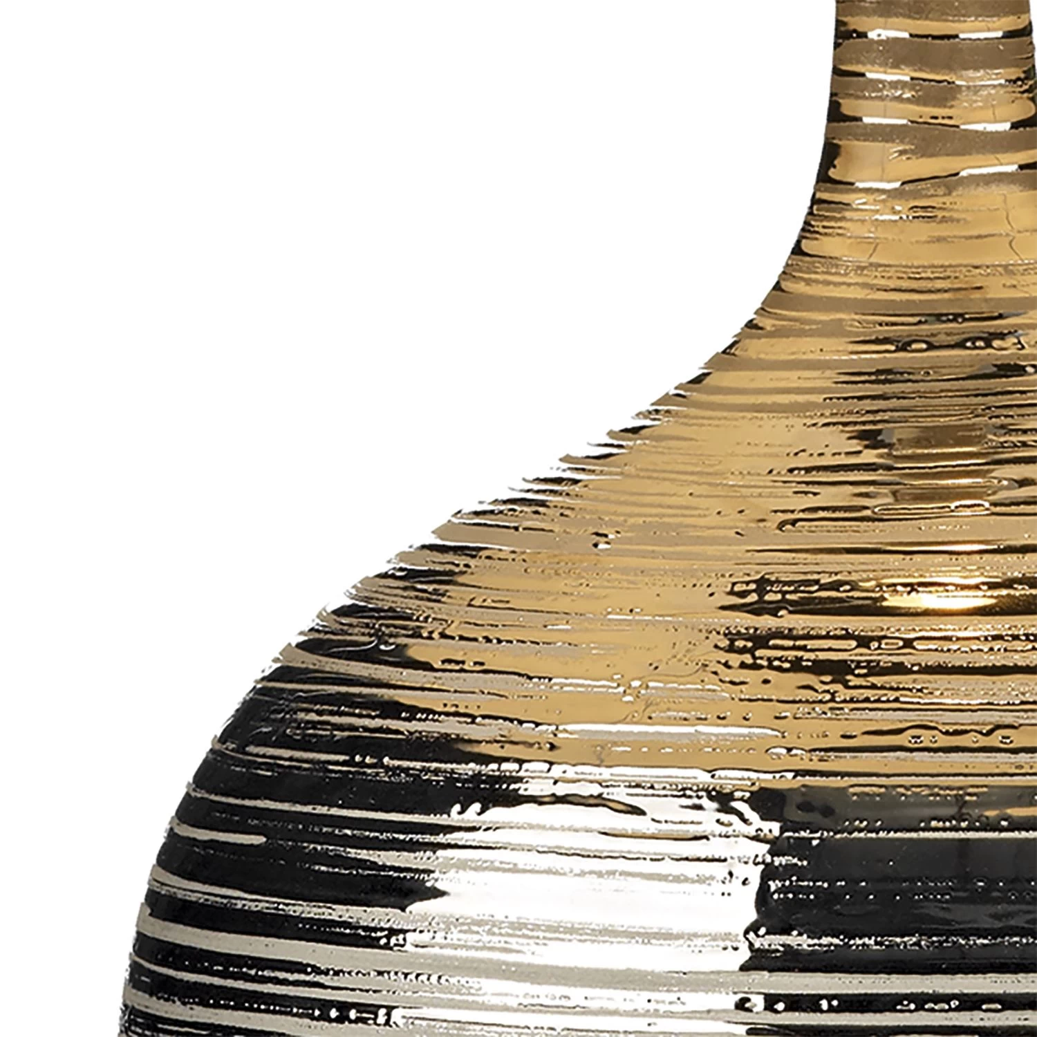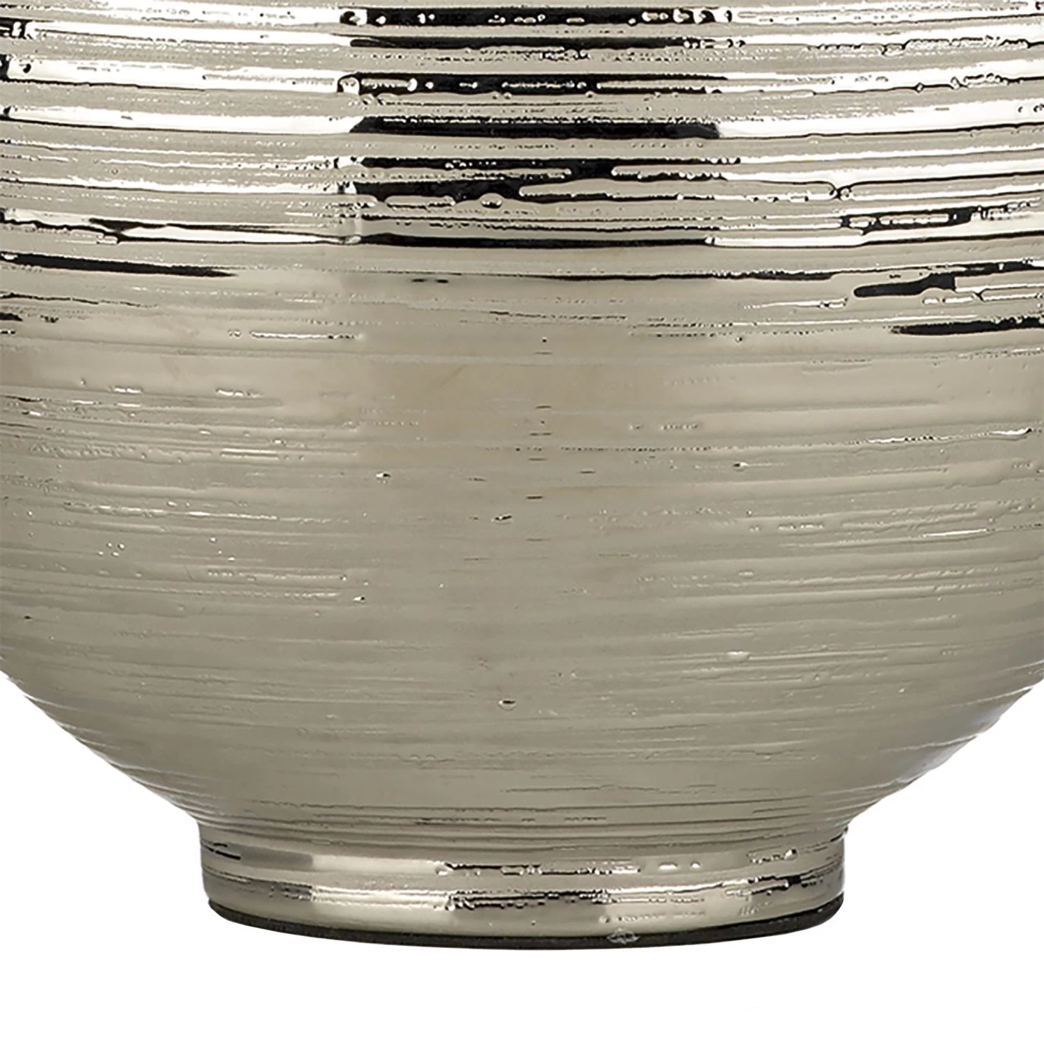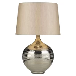 The GUSTAV Table Lamp features a silver textured ceramic base and has a silver faux silk tapered drum shade.