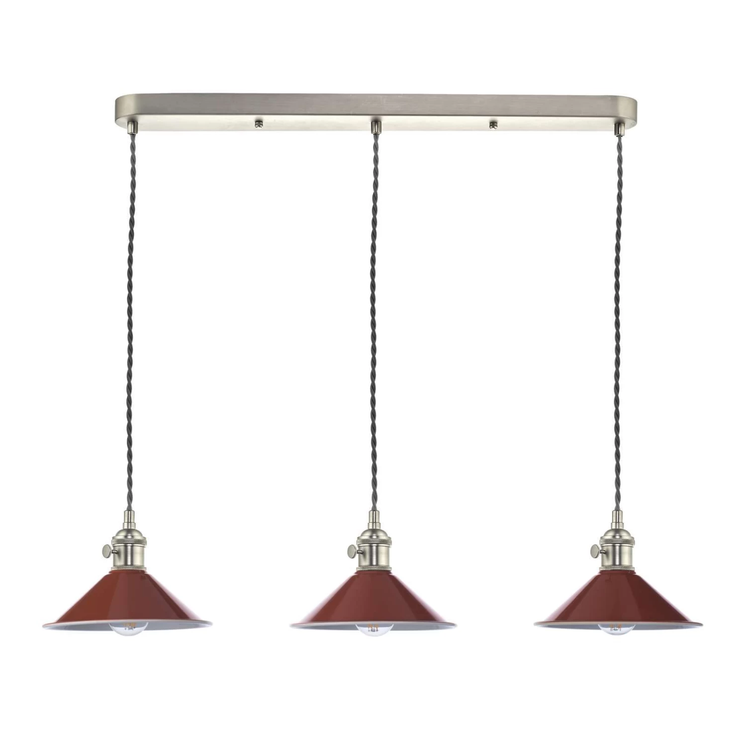 This all-metal version has a vintage-look cone shade in an earth burnt red gloss finish and white inner, complemented by a sophisticated antique chrome finish ceiling rose and machined lamp holder.