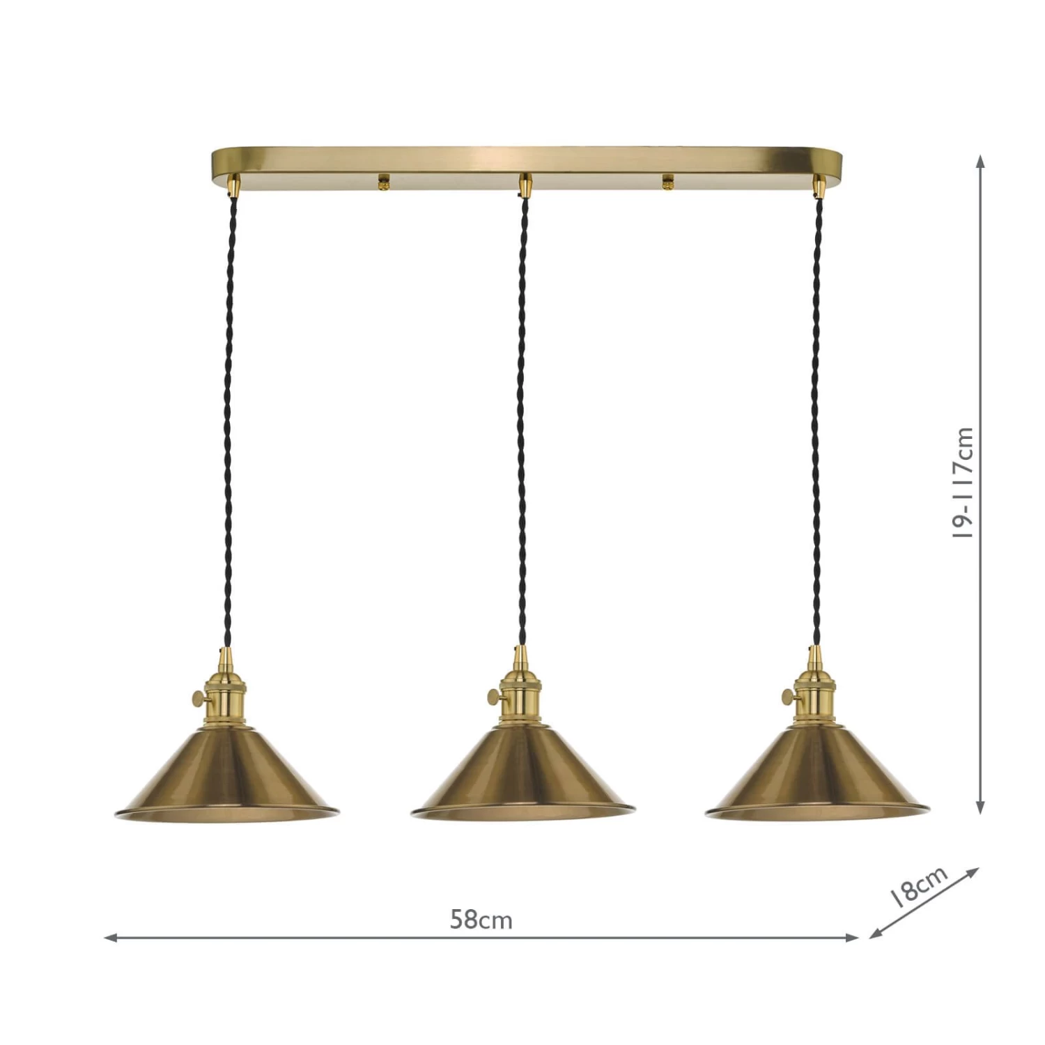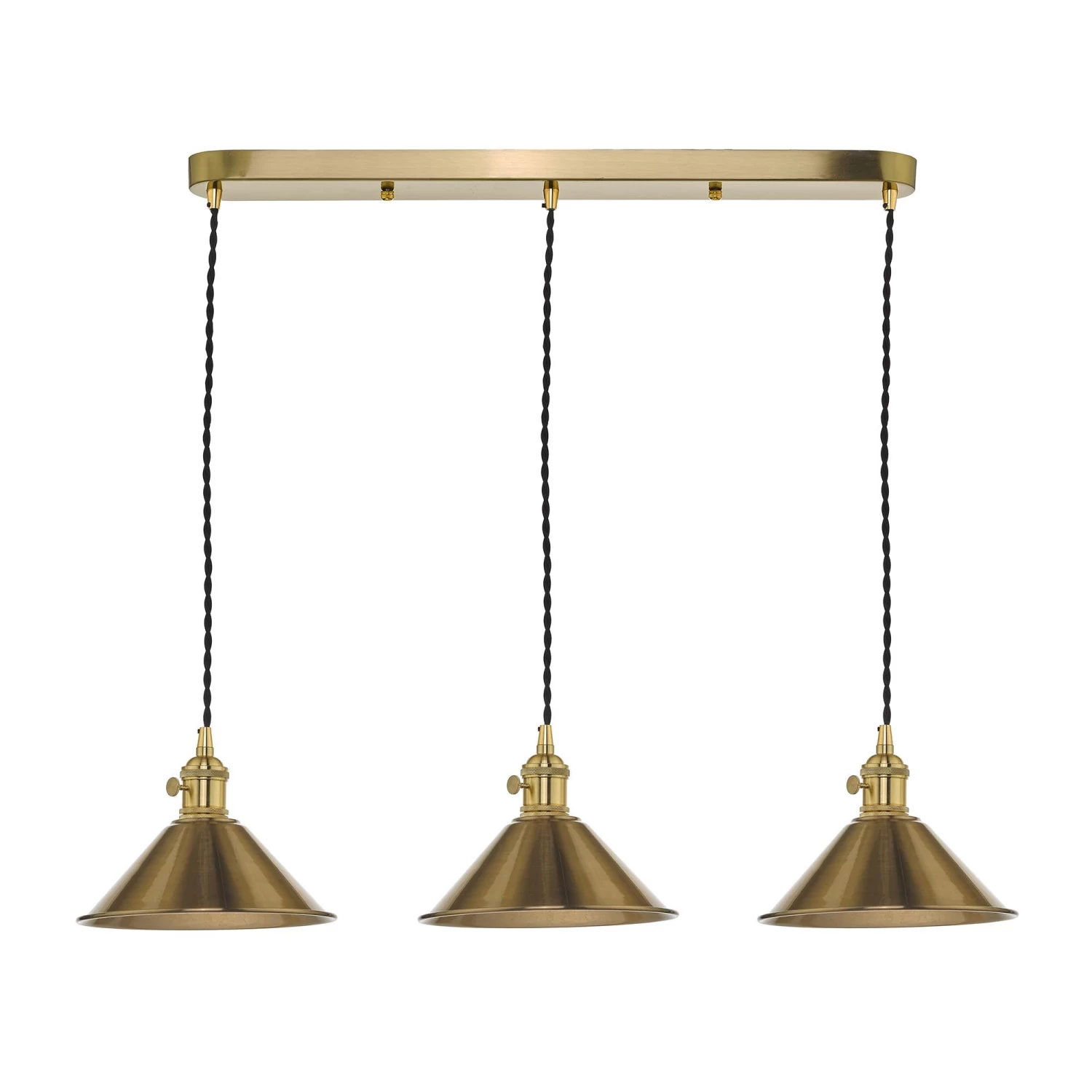 This all-metal version has a trio of vintage-look cone shades of spun steel with rolled edges, finished in aged brass, complemented by the warm natural brass ceiling bar and lamp holders.
