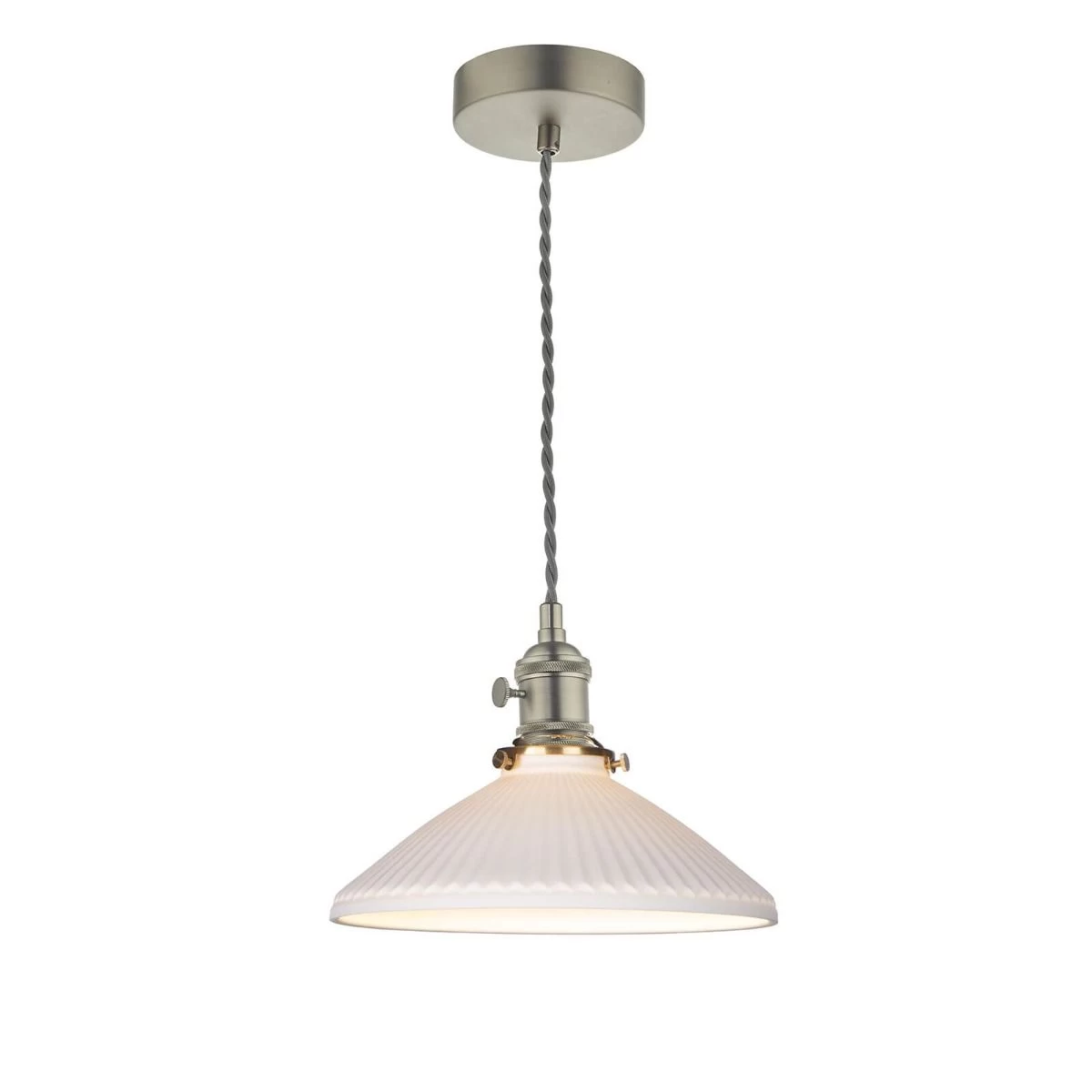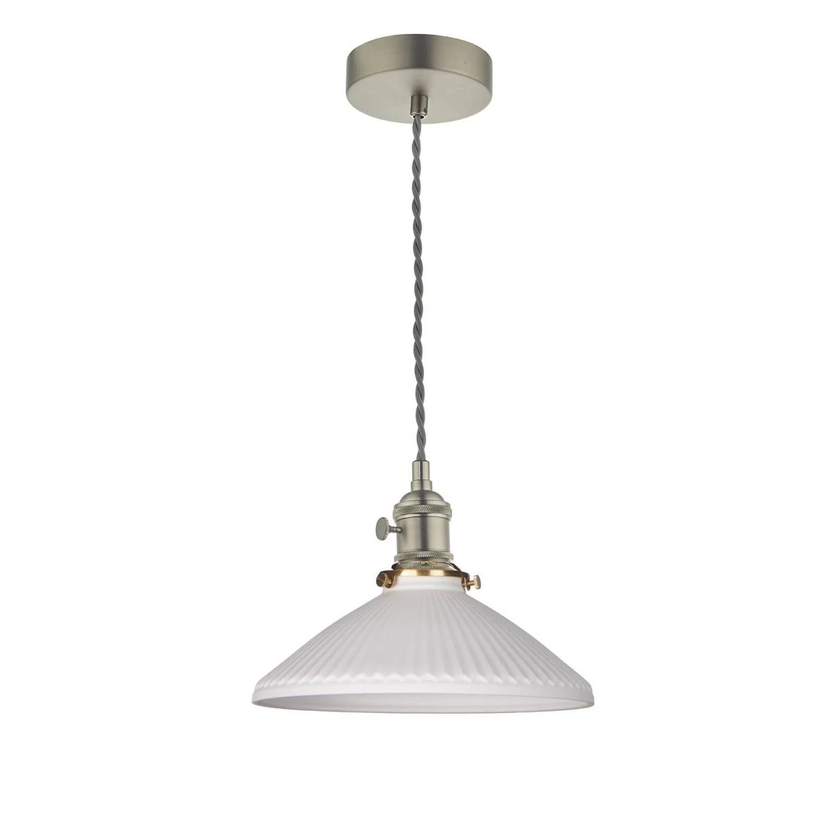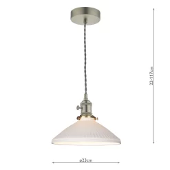 The Hadano Pendant Antique Chrome & Ceramic Shallow Shade offers a beautiful warm glow when lit, with its fine ribbed antique white ceramic shade and antique chrome frame. The Hadano pendant light features a twisted braided cable for a vintage farmhouse look. The Hadano pendant light features a height adjustable braided cable allowing you to set the perfect height. The Hadano pendant light takes a single E14 (SES) golf ball bulb (not supplied), We recommend using LED filament lamps from our range of LED bulbs
