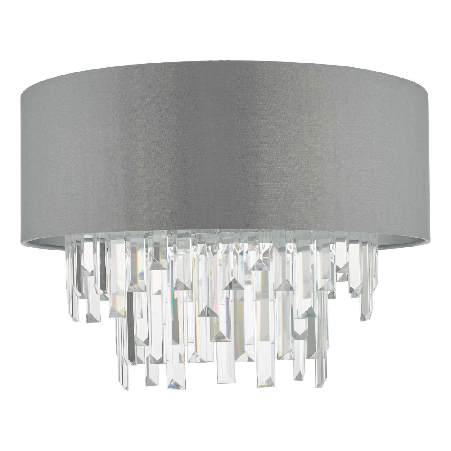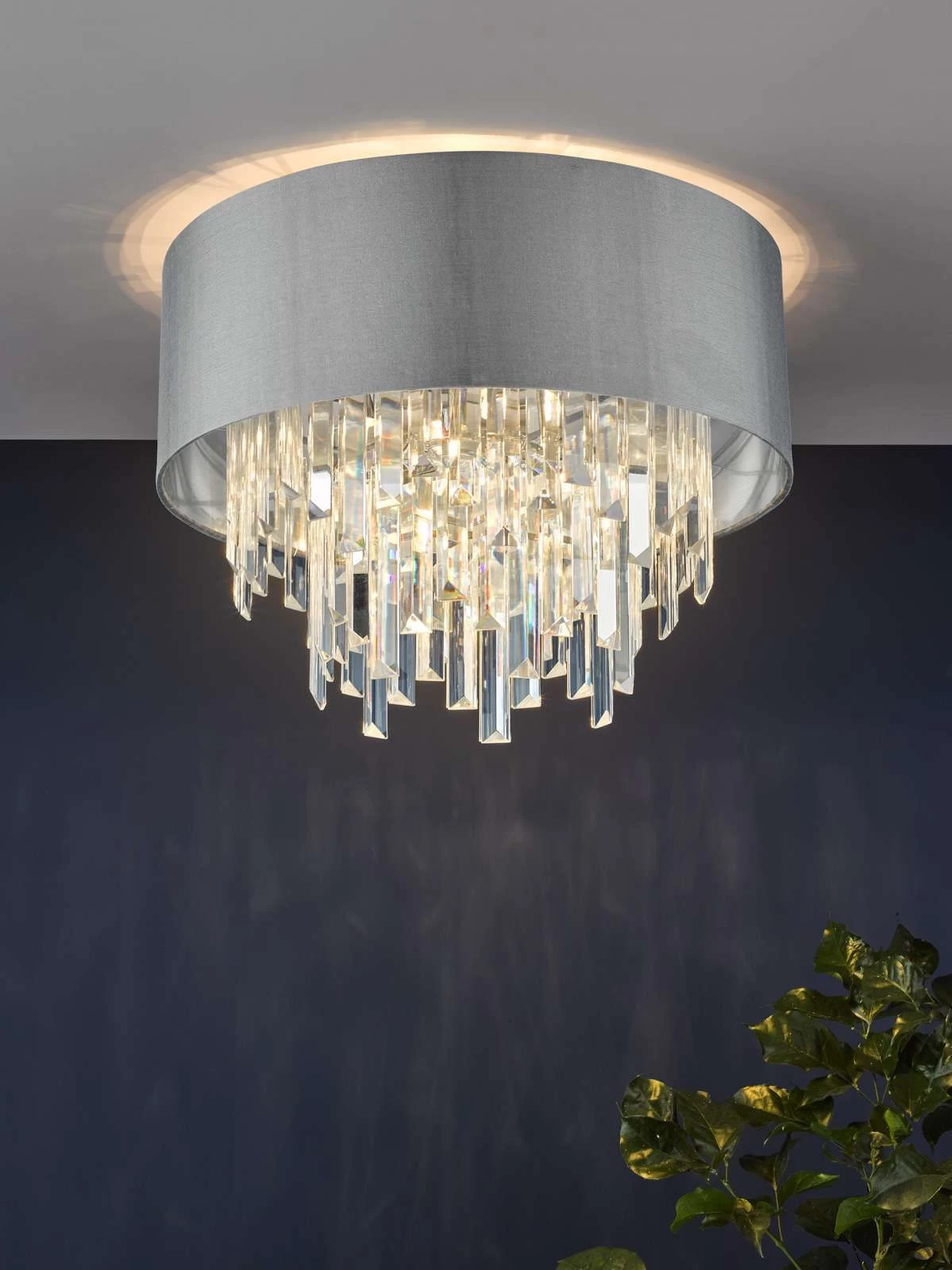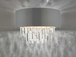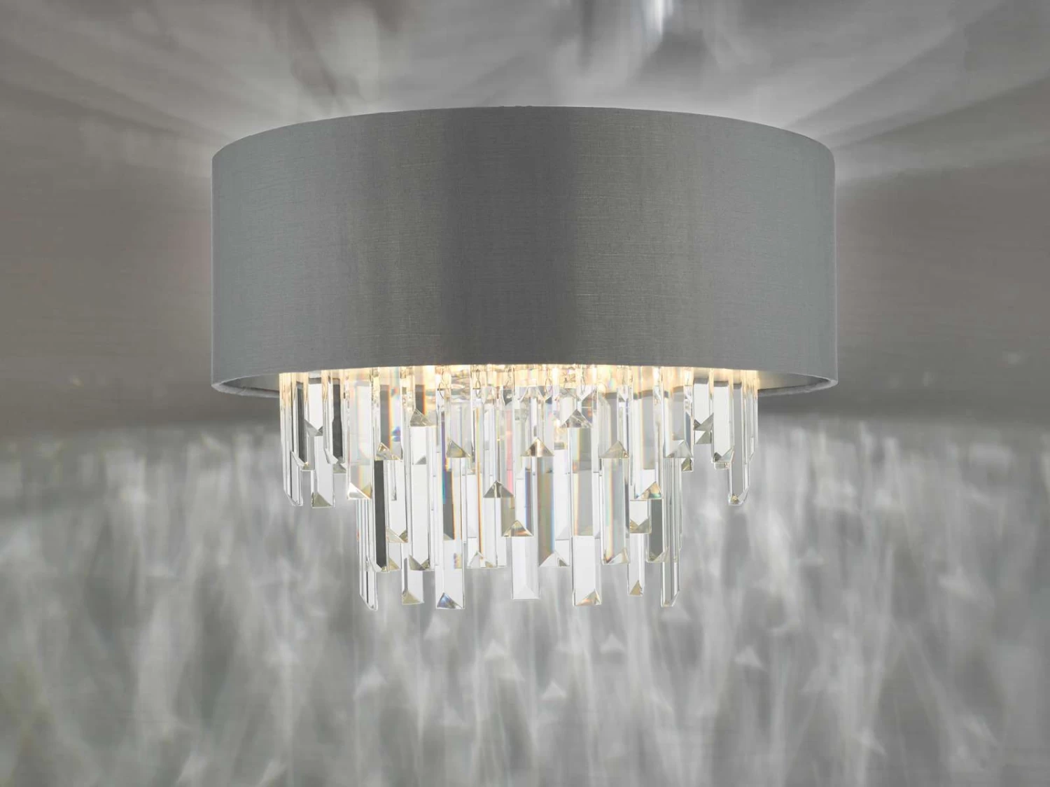 Featuring two tiers of crystal and a grey satin drum shade with silver lining that adds a clean simplicity to the overall ceiling light, making it perfect for a bedroom or sitting room.