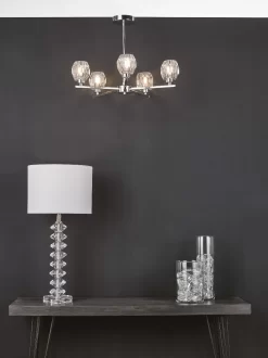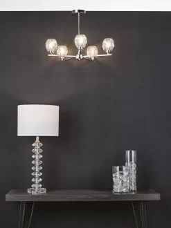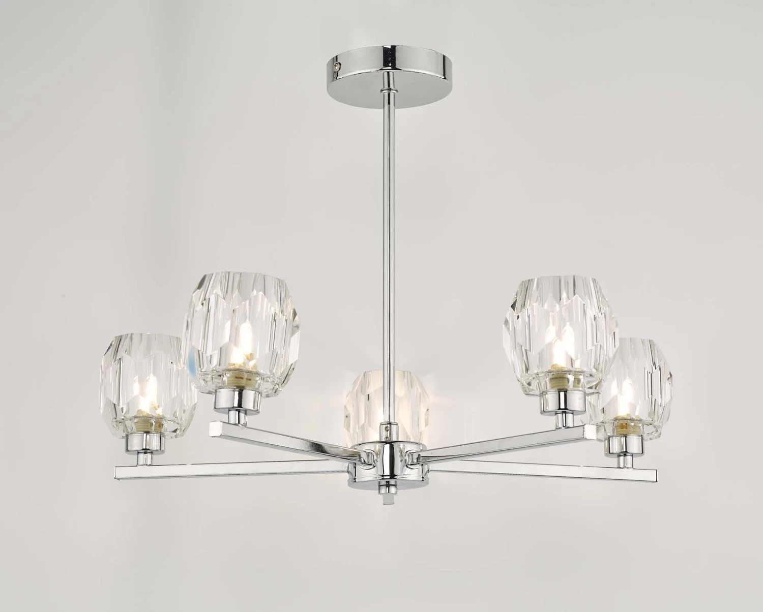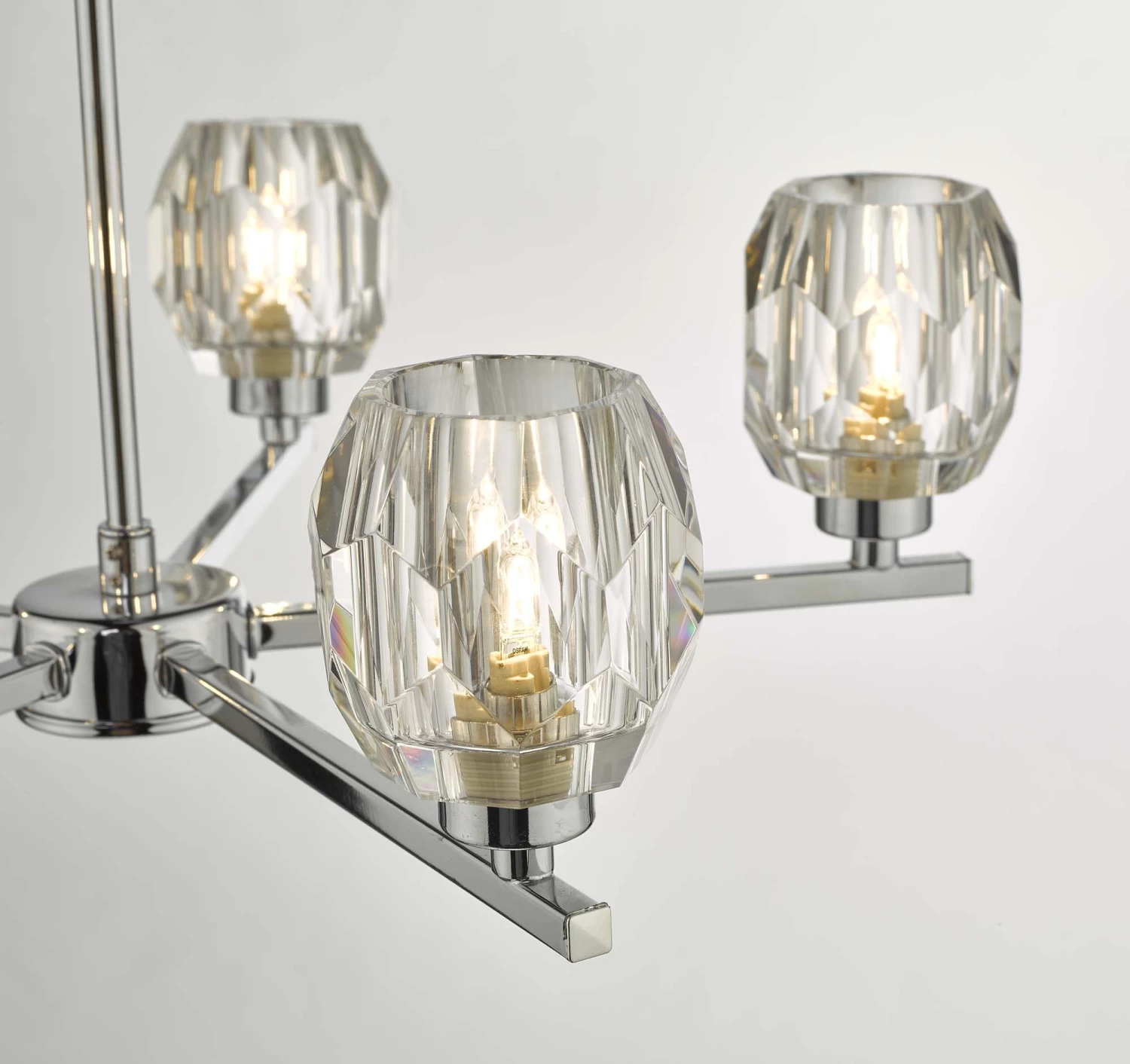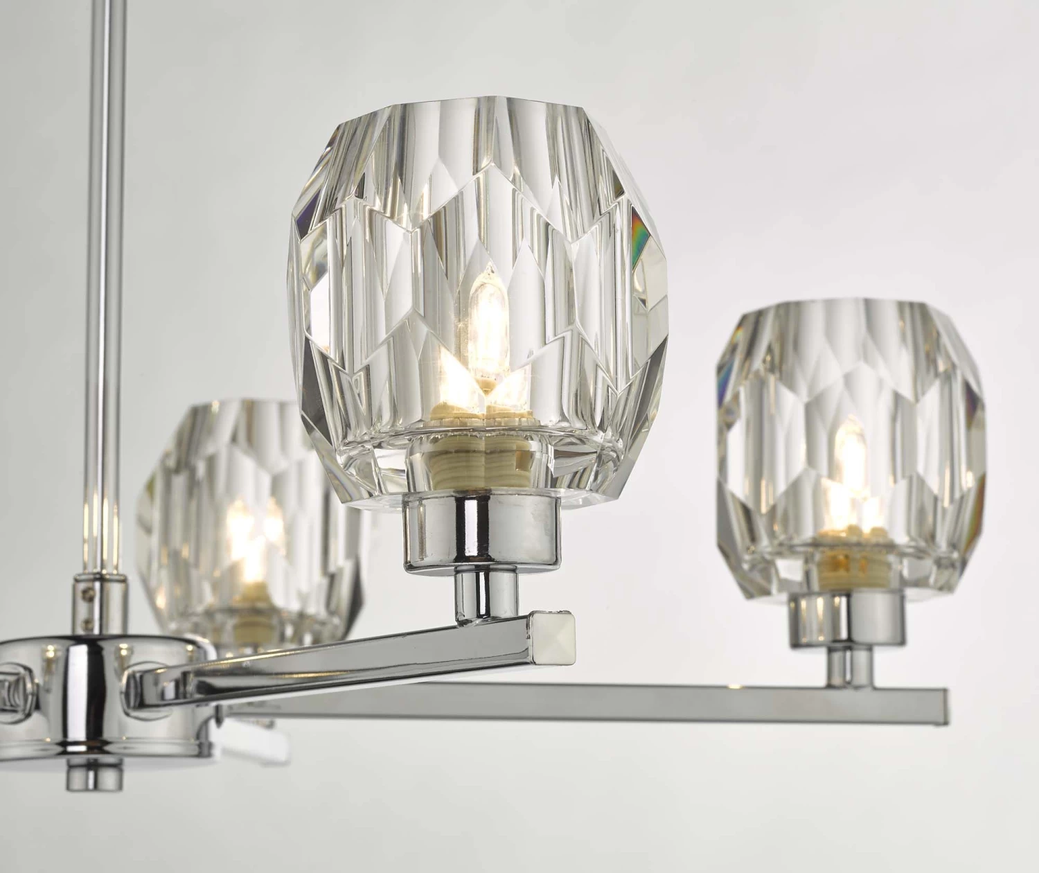 The Idina 3 light Pendant IDI5450 features beautiful faceted glass shades resting on slender square polished chrome finish arms. Part of the Idina range which also features a smaller similarly styled 3 light semi flush IDI5350