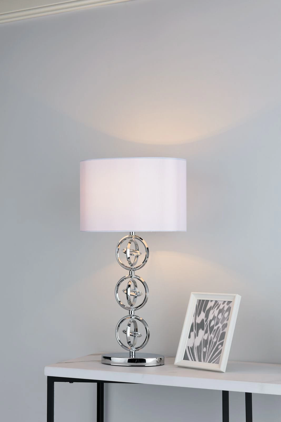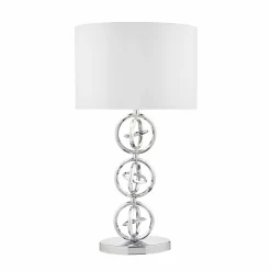 The Innsbruck is an elegant table lamp in polished chrome with interlocking circular rings. Finished with a luxury faux silk lined shade in ivory.