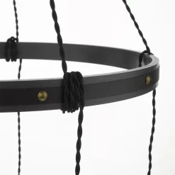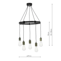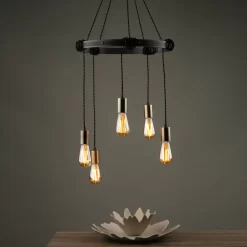 Ivan is a real statement piece in industrial chic. A rustic wooden and metal ring is suspended by vintage cable. Each lamp is adjustable in height by simply wrapping the cable around the frame; you can have them all the same height, in a random cluster or spiralling around and down, to suit your interior space. Finished with aged brass fittings for an authentic look. Complete the look with a set of vintage filament lamps.