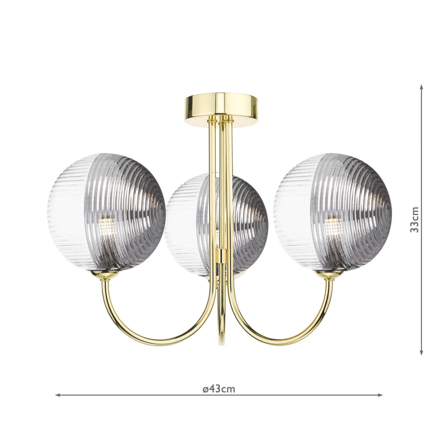 The Jared 3 Light Semi-Flush Polished Gold & Smoked/Clear Ribbed Glass is a beautiful semi-flush fitting with unique oversized asymmetric glass shades which are half smoked and half clear with opposing radial and linear ribbing. The simple polished gold frame suits low ceiling rooms and allows the glass to really shine. The Jared semi-flush is suitable for an entryway, dining room or anywhere a little style is needed.