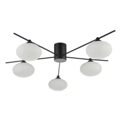 The minimalist Jasper 5lt semi-flush ceiling light is finished in matt black with subtle spiral textured opal glass resting on fine black arms mounted on a narrow minimalist centre body.