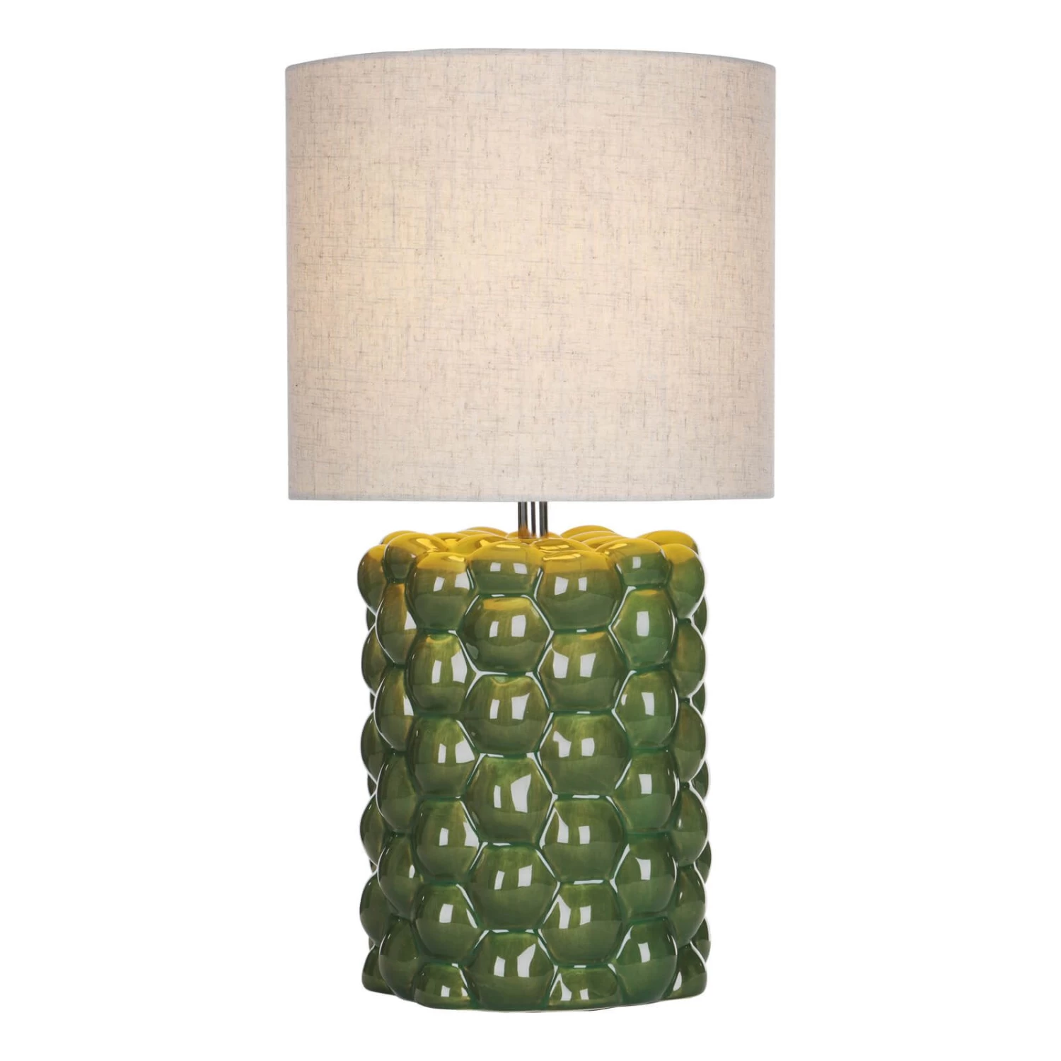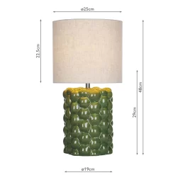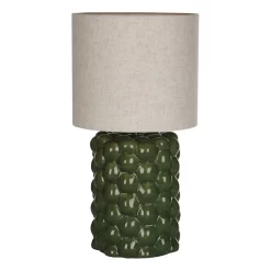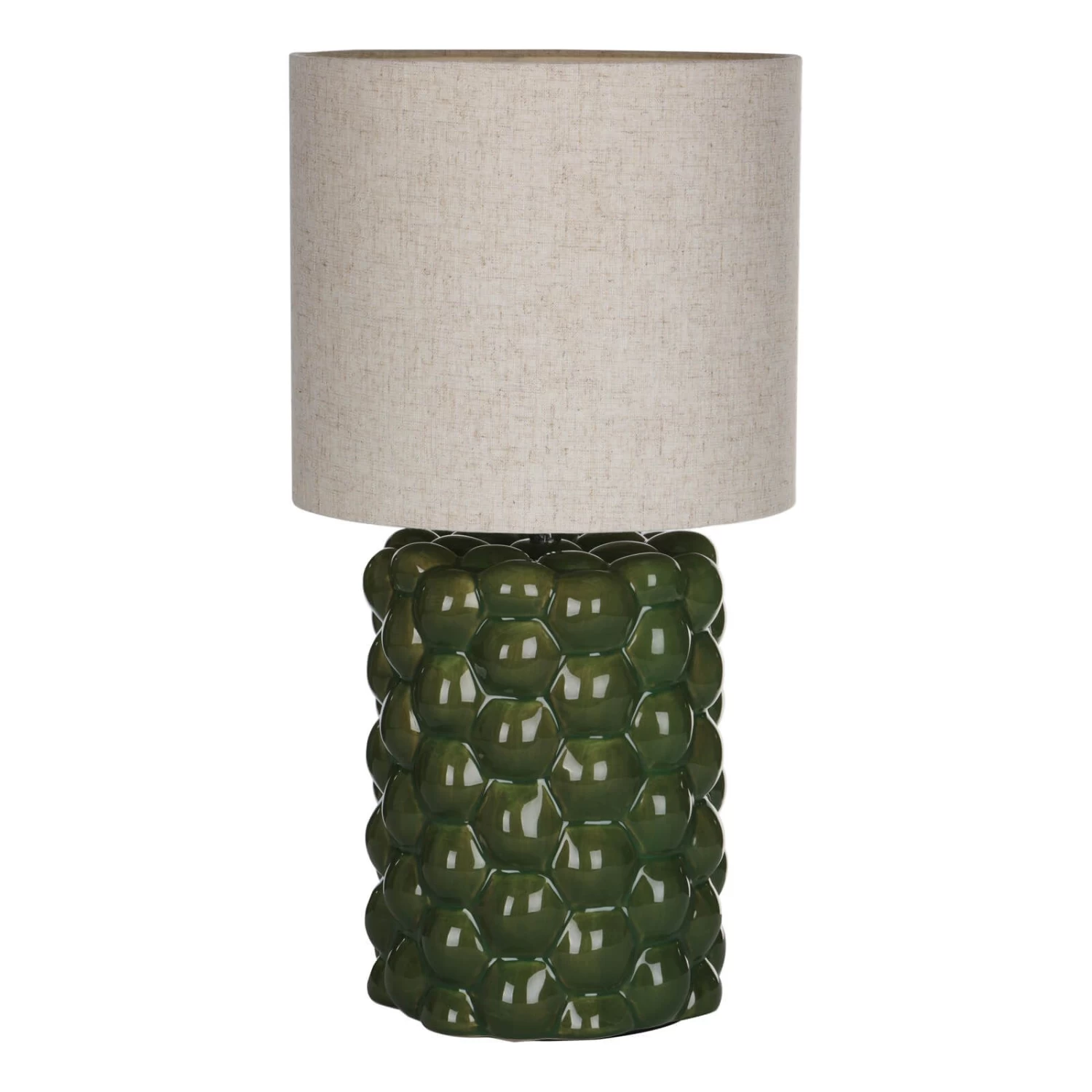 The Jayden ceramic table lamp is a retro-inspired cylindrical table lamp with a bobble surface finish and a burnt umber glaze. Finished with a natural linen shade.