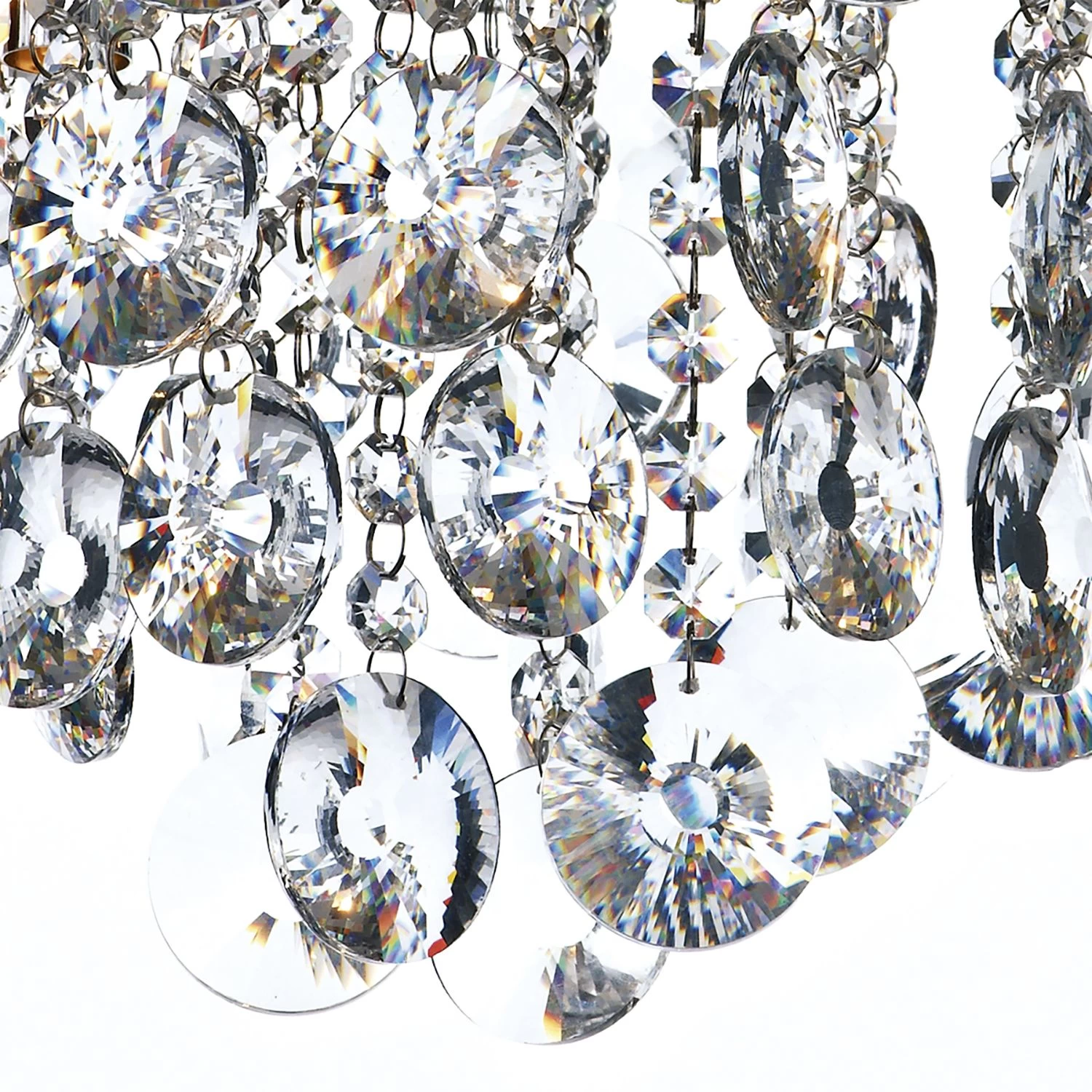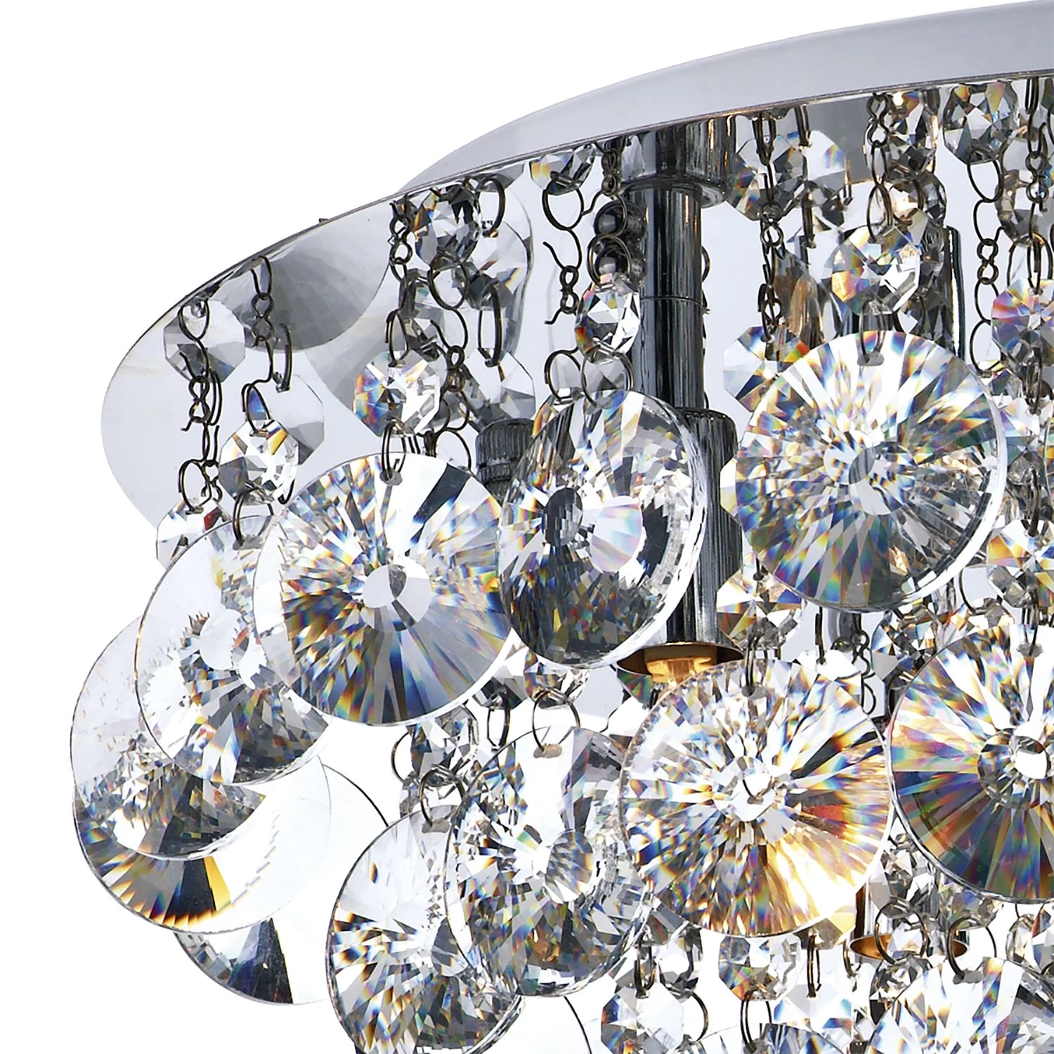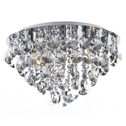 JESTER 5lt Flush fitting has a tiered arrangement of clear crystal glass beads and drops and a polished chrome ceiling plate.