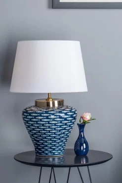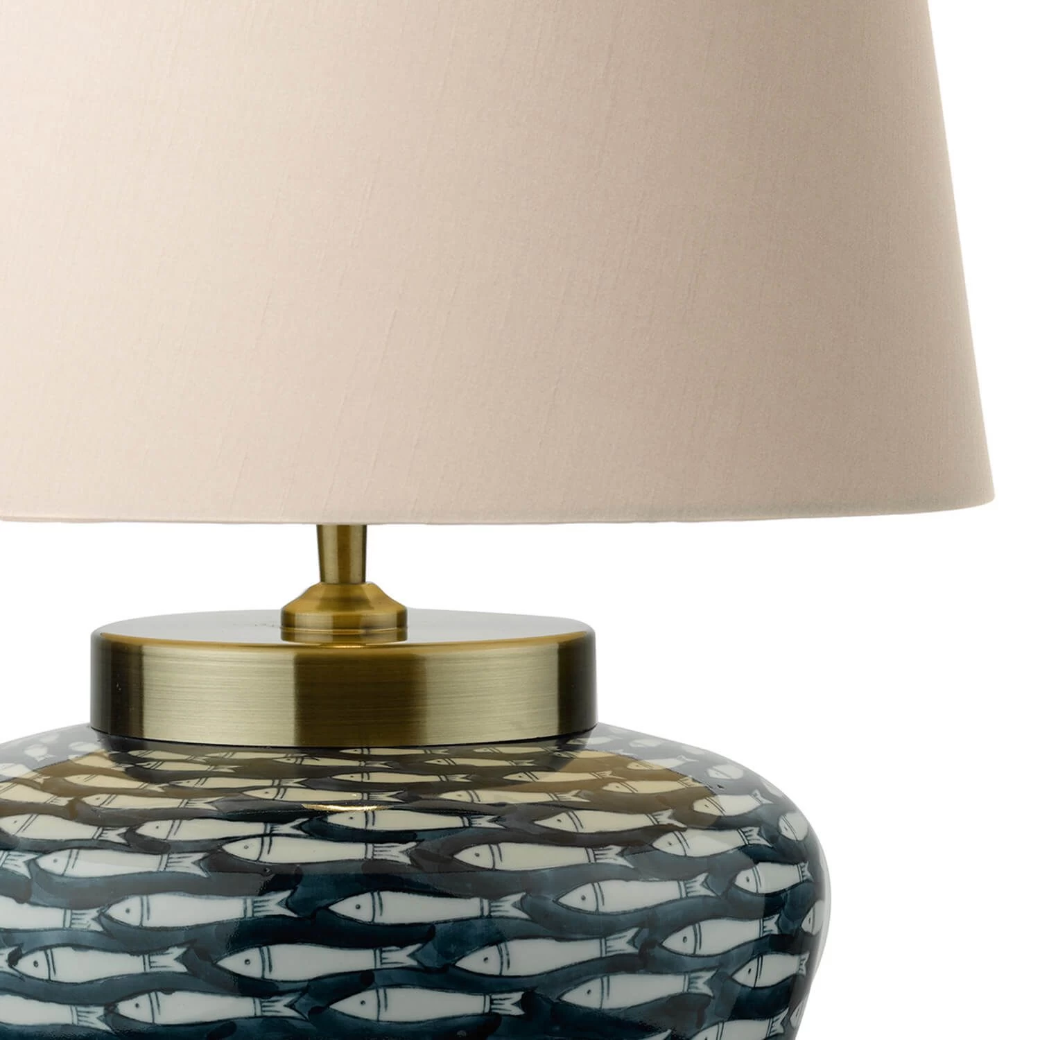 The JOY is a traditional Chinese porcelain ginger jar style table lamp, finished by hand with a shoal of fish motif picked out in cream on a deep blue background. Topped with an antique brass shoulder plate.