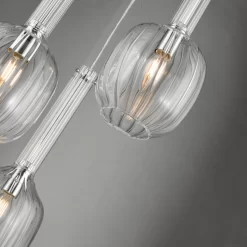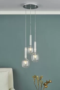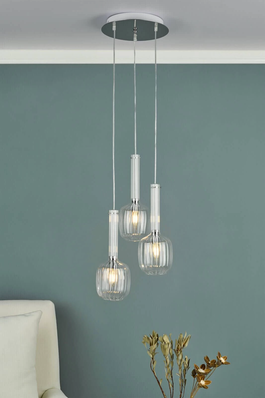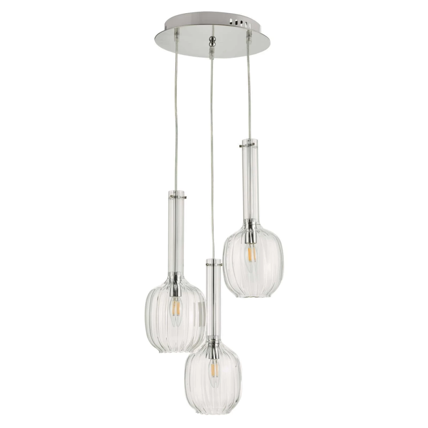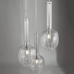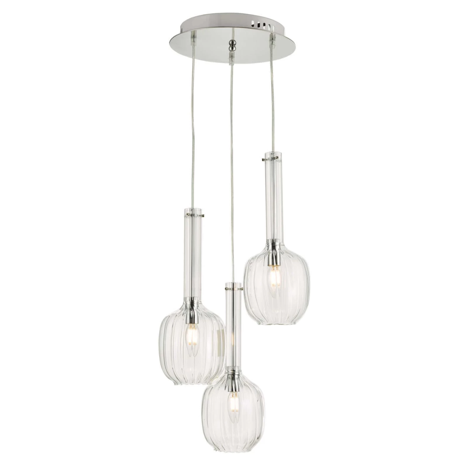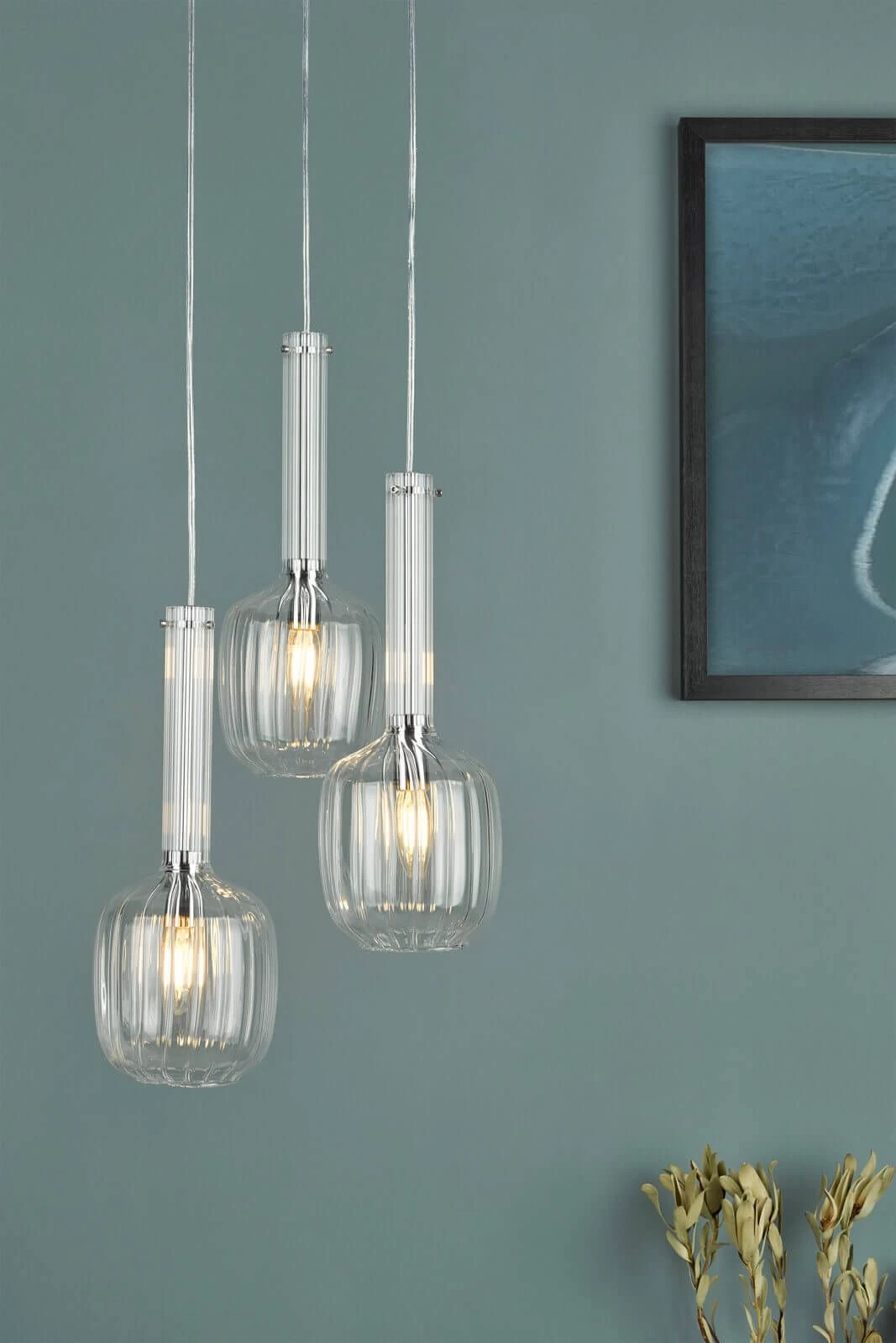 The 3 light Eifel cluster pendant ceiling light features lozenge shaped ribbed glass shades, complemented by bright polished chrome. The three lamp holders are suspended within their shades at different heights from a flat round ceiling plate that is mirror polished to double the illumination. With a long fall, and interesting shaped shades, this is a superb light for a tall stairwell or galleried reception hall.